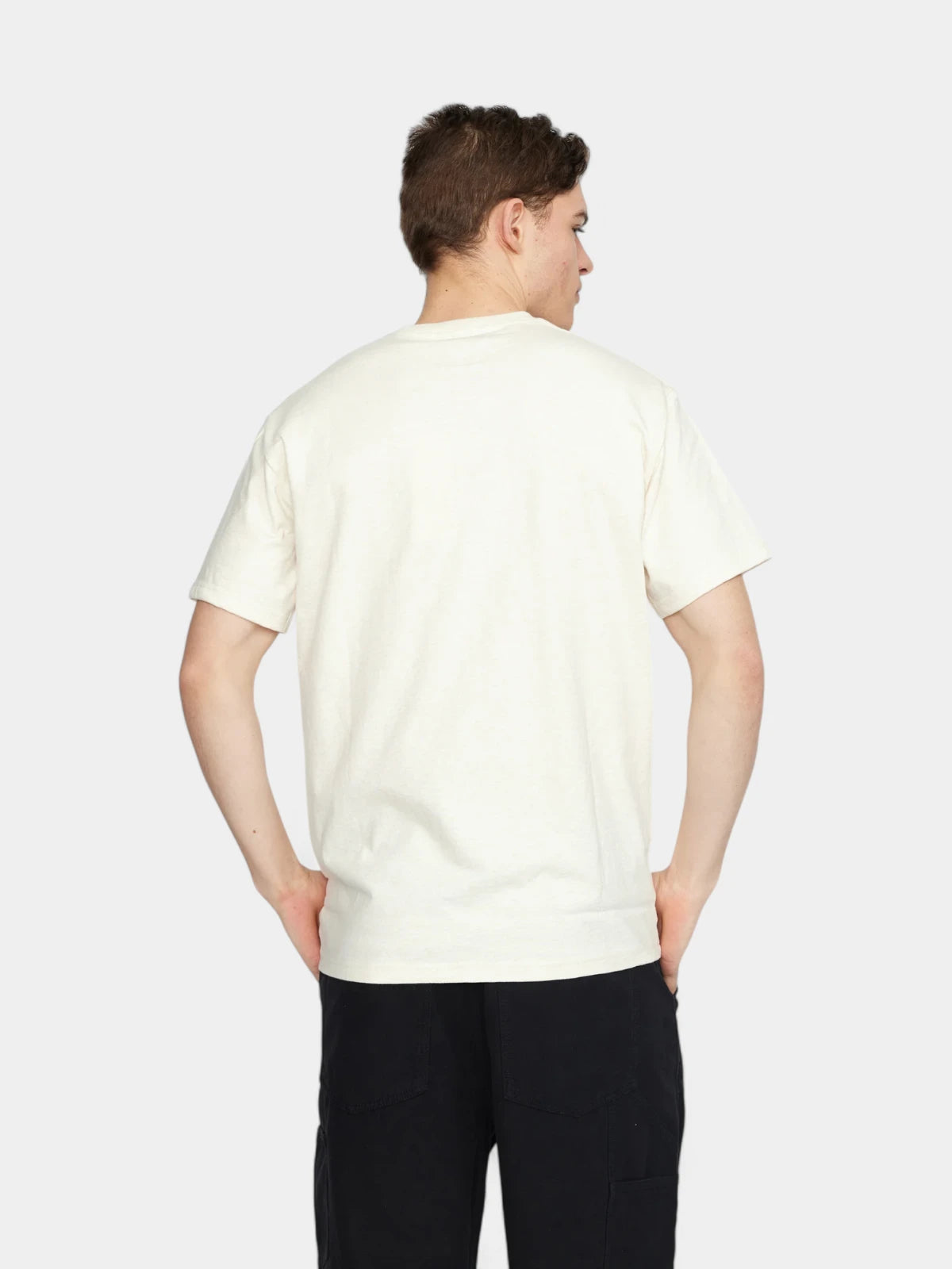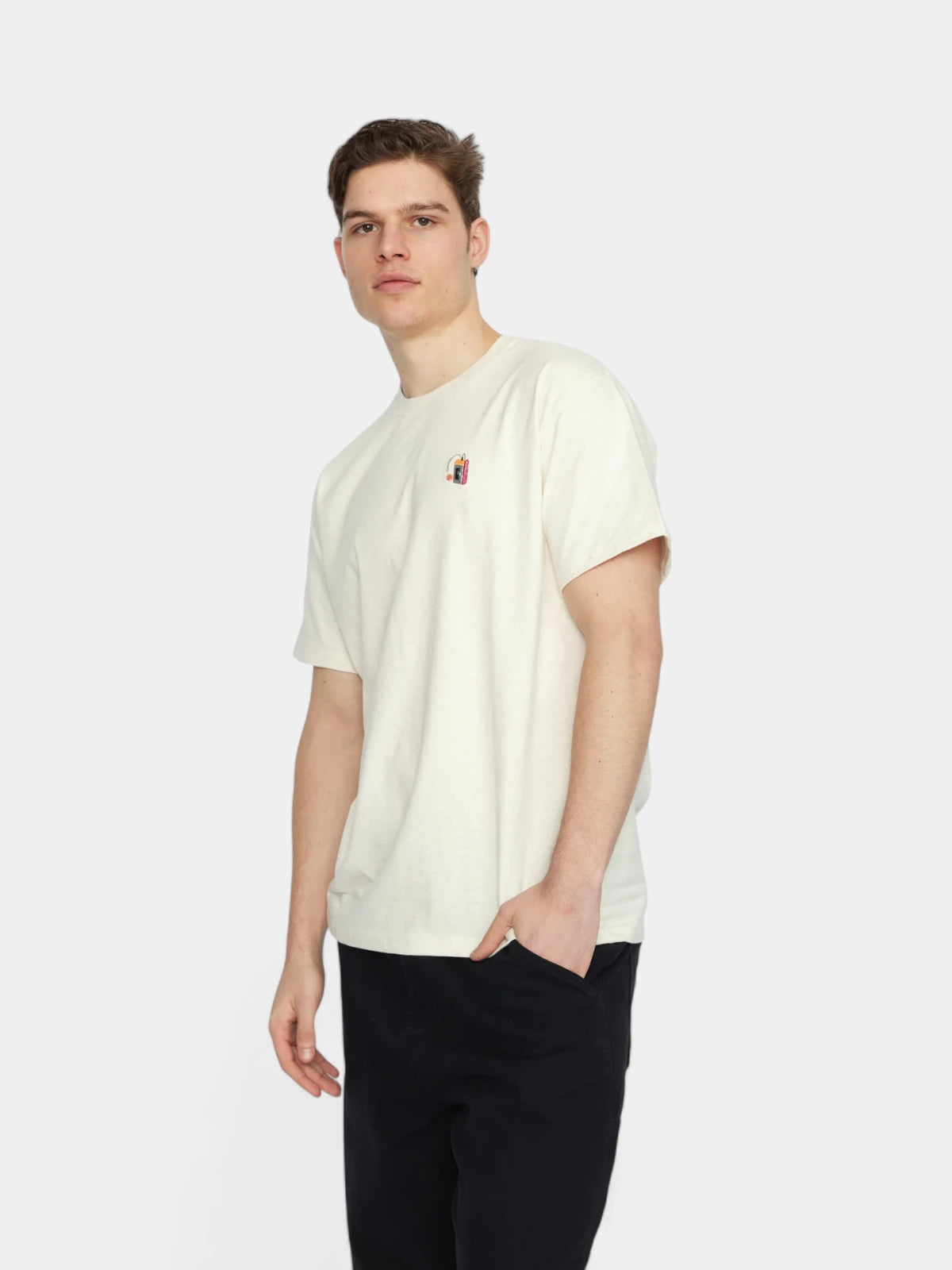 Application T-shirt i farven Offwhite er en t-shirt med en afslappet pasform fra Revolution, perfekt til både afslapning og hverdagsbrug. Den er fremstillet af 100% økologisk bomuld med en vægt på 200gsm, hvilket giver en blød, behagelig og holdbar kvalitet, der kan holde til daglig brug. T-shirten har en klassisk rund hals og korte ærmer, hvilket giver et tidløst look, mens det lille, farverige broderi på brystet tilføjer et subtilt, men stilfuldt element til designet. Den enkle offwhite farve gør den alsidig og let at style med forskellige outfits.