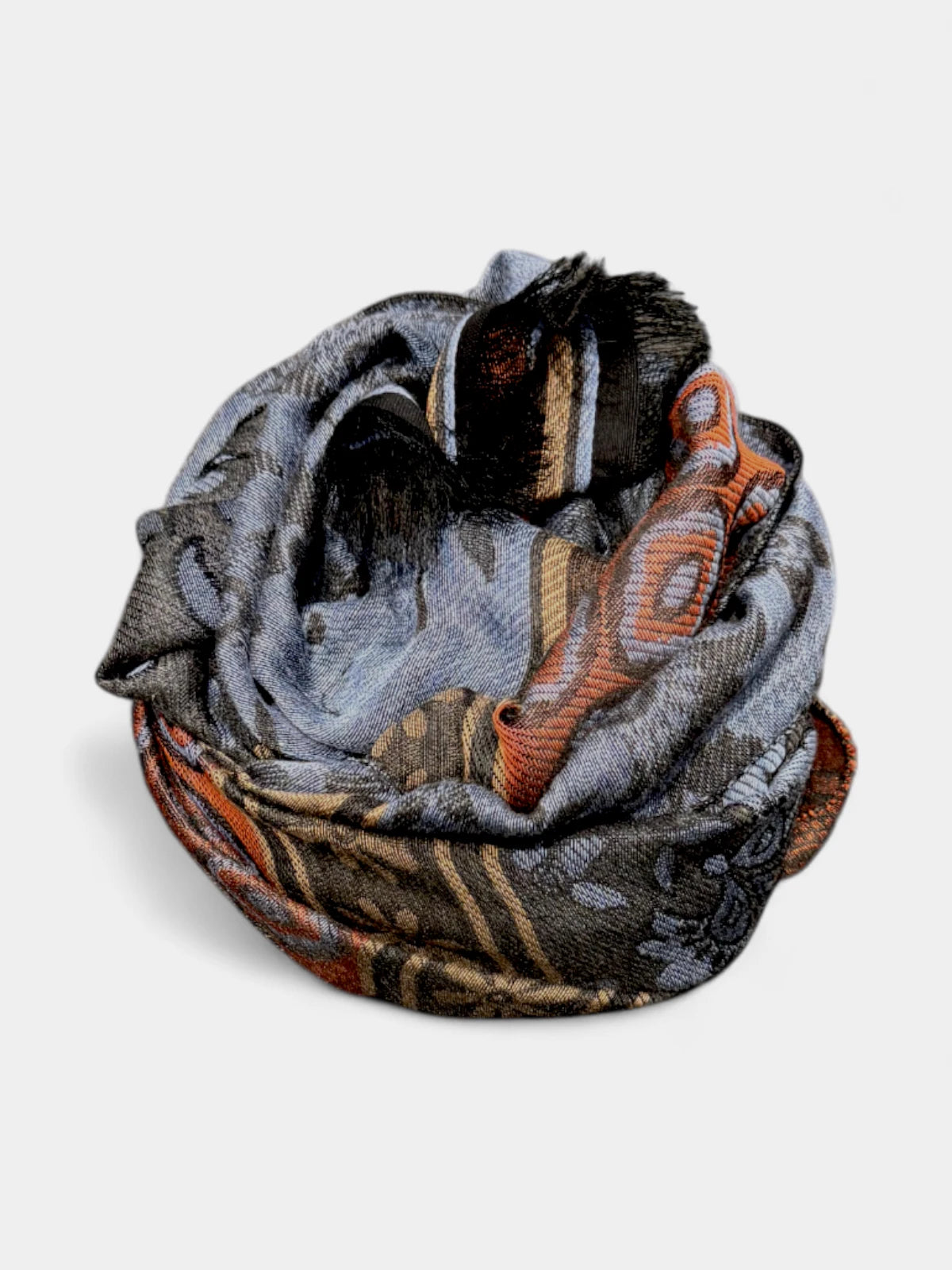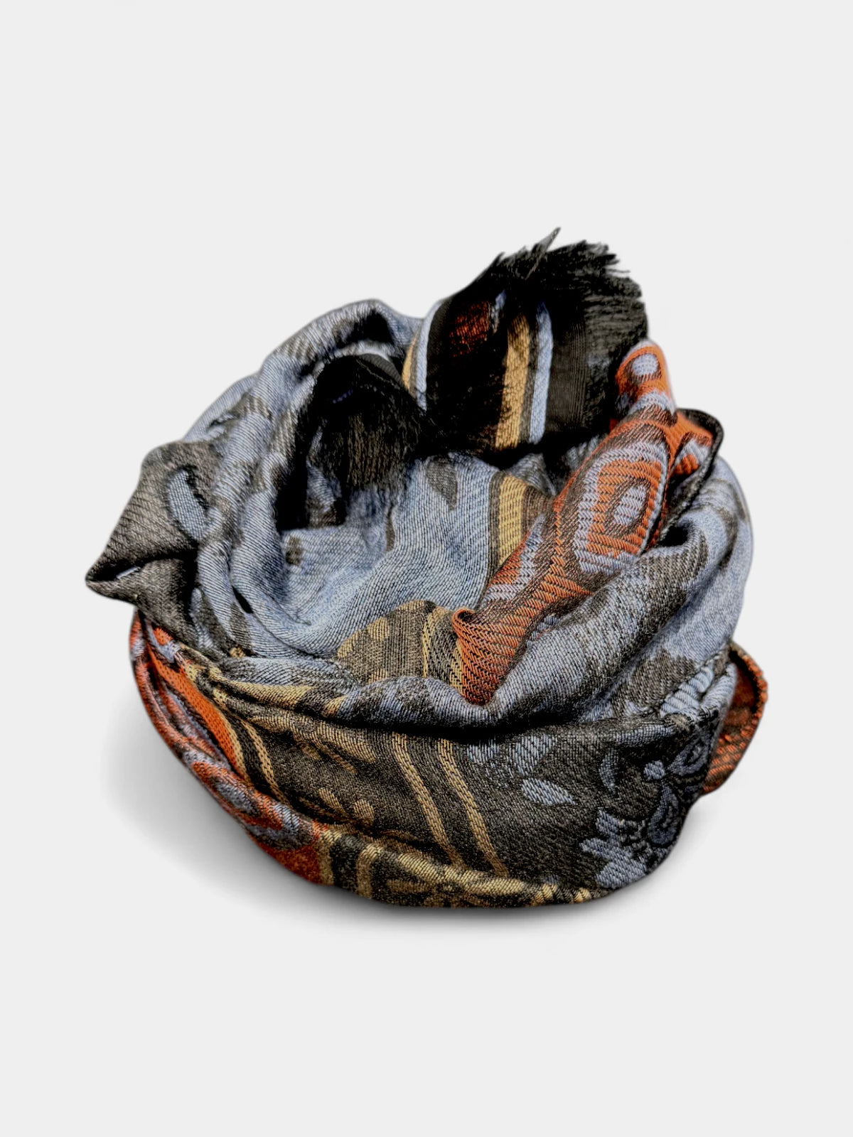 Designet fremstår i en varm orange tone med diskrete blå nuancer og et raffineret mønster, der tilfører dybde og personlighed. Et stilfuldt accessory, der bringer farve og karakter til enhver garderobe – med den velkendte italienske sans for detaljer.
