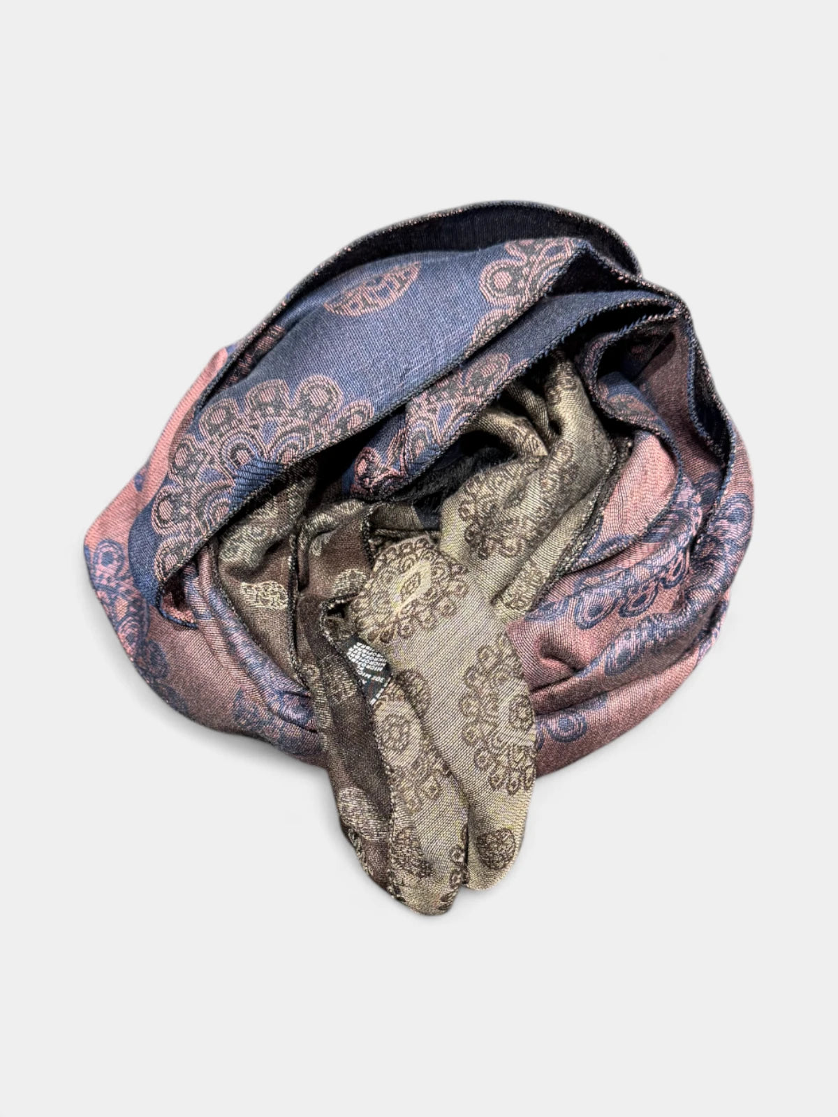 Det raffinerede paisleymønster i støvede blå og rosatoner giver tørklædet et klassisk og sofistikeret udtryk. Kombinationen af farver og mønster skaber et tidløst look, der passer til enhver garderobe. Como Scarf er et alsidigt accessory, der tilføjer et strejf af italiensk elegance til dit outfit.