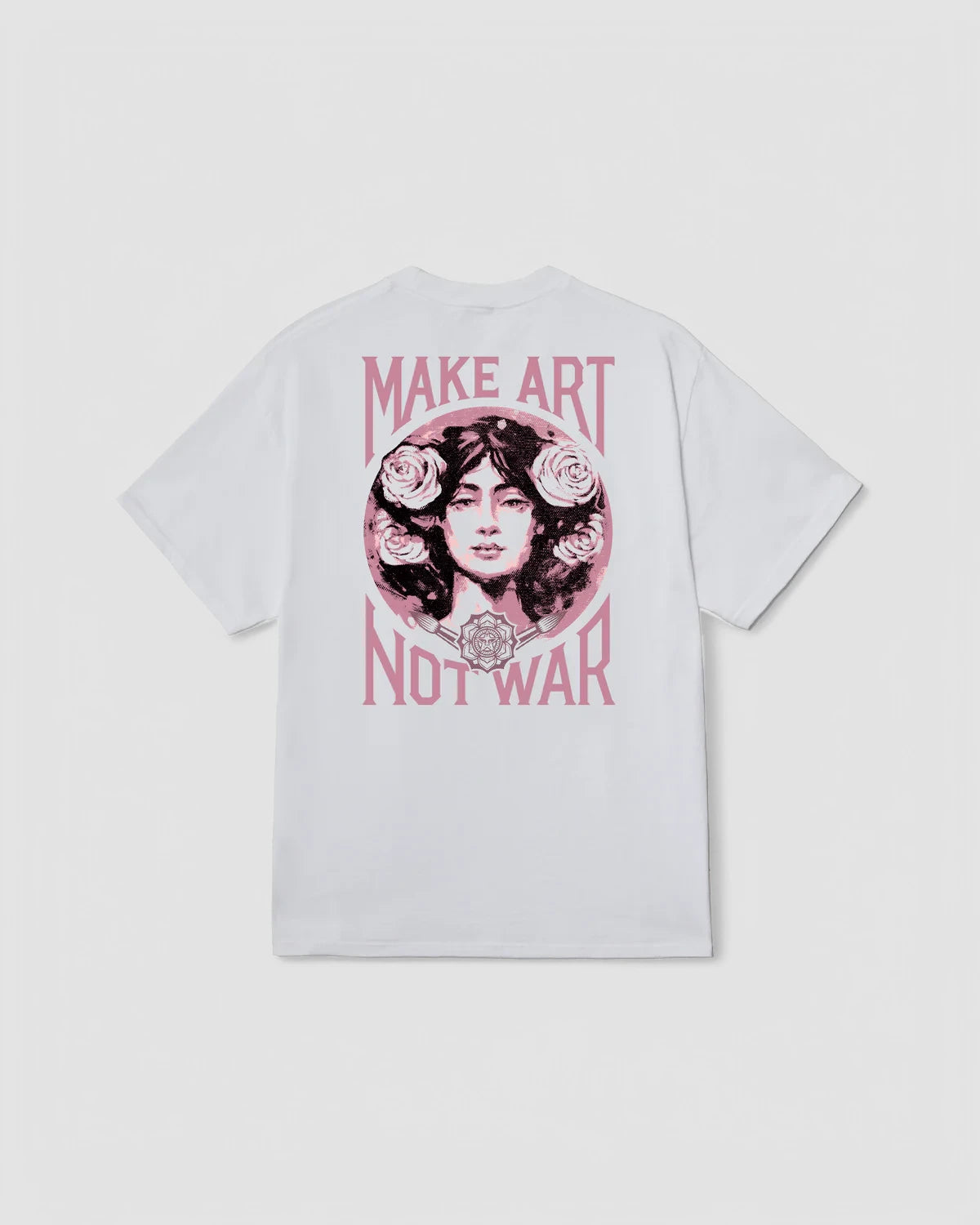 OBEY Make Art Not War Classic T-shirt i hvid er en hyldest til kreativitet og fred. Med det ikoniske "Make Art Not War"-motiv kombinerer denne t-shirt politisk bevidsthed med klassisk streetwear-stil. Den er fremstillet i 100 % blød bomuld, hvilket sikrer en behagelig pasform og høj kvalitet. Det tidløse design gør den nem at style til både afslappede og mere statement-prægede looks