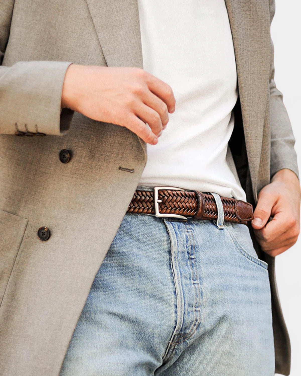 Elastisk læderfletbælte i brune nuancer, der passer til både outdoorsy outfits og rå jeans. Bæltet har læderbesætninger ved spidsen og spændet, lavet af slidstærkt narvlæder — den stærkeste del af læderet. Læderet er vegetabilsk garvet i Italien med naturlige ekstrakter som mos, kastanjer og bark, hvilket giver det en autentisk og bæredygtig finish.