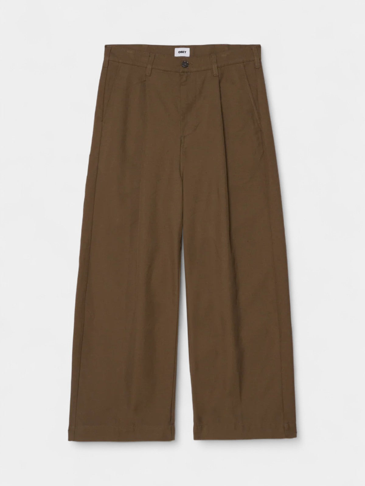 Oliver Pleated Pant fra Obey er et par bukser med klassisk lukning foran med knap og lynlås, praktiske lommer både foran og bagpå samt et diskret logomærke. De er fremstillet i en blanding af polyester og rayon med en kraftig vægt på 11,5 oz, hvilket giver et holdbart og behageligt materiale. Bukserne har en løs, baggy pasform med lige ben og en bred benåbning, der fuldender det stilfulde og tidløse udtryk.