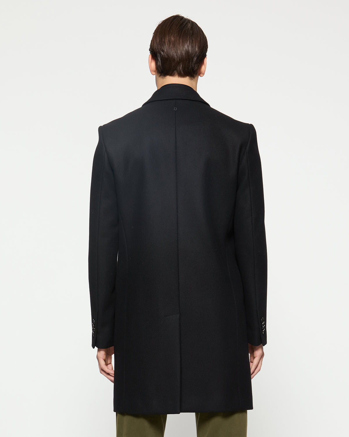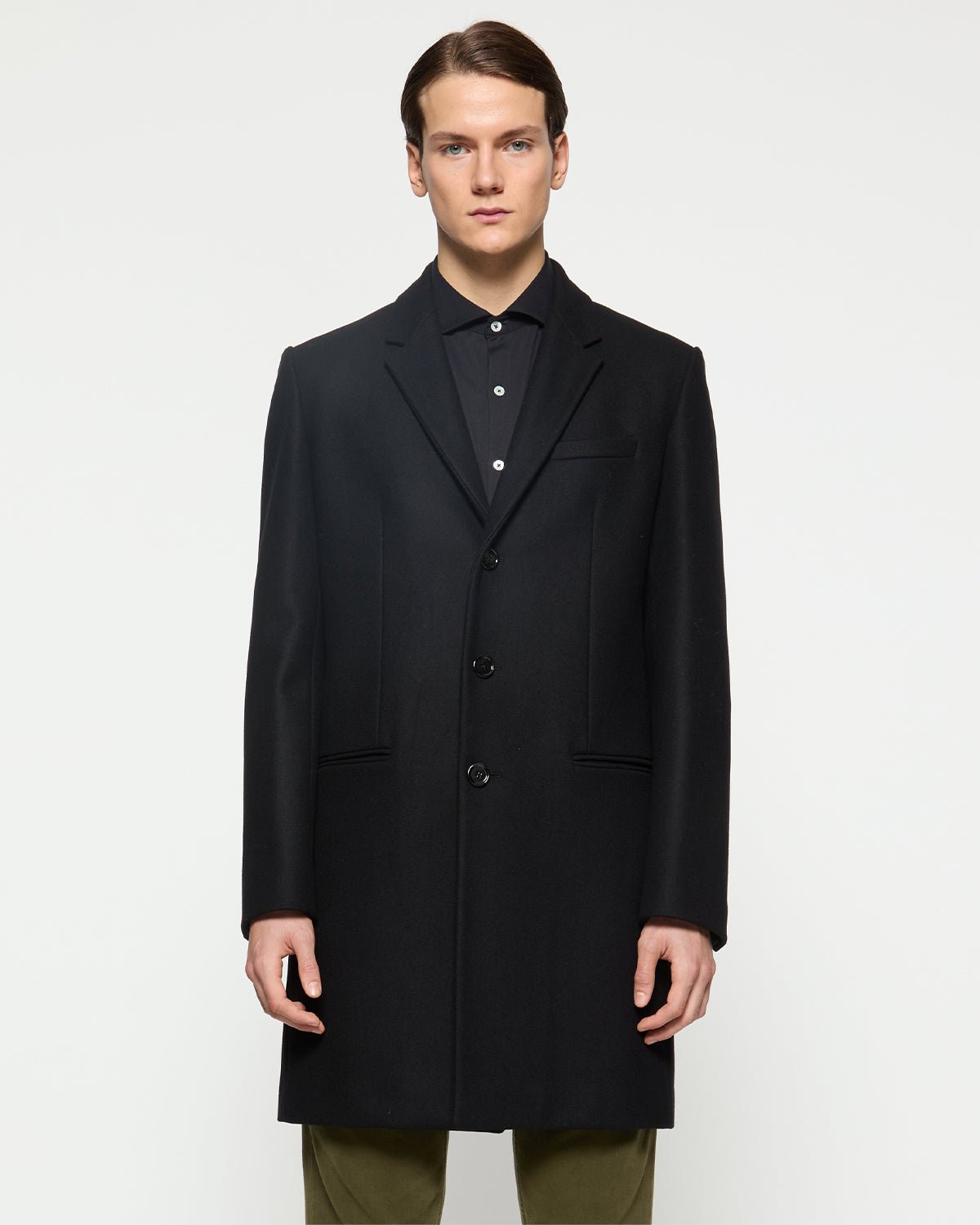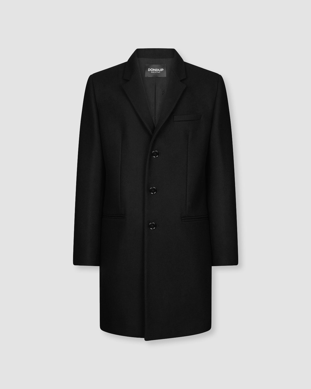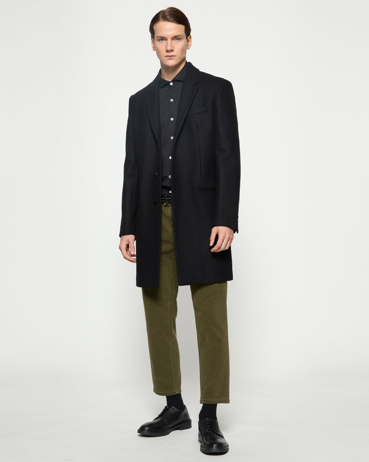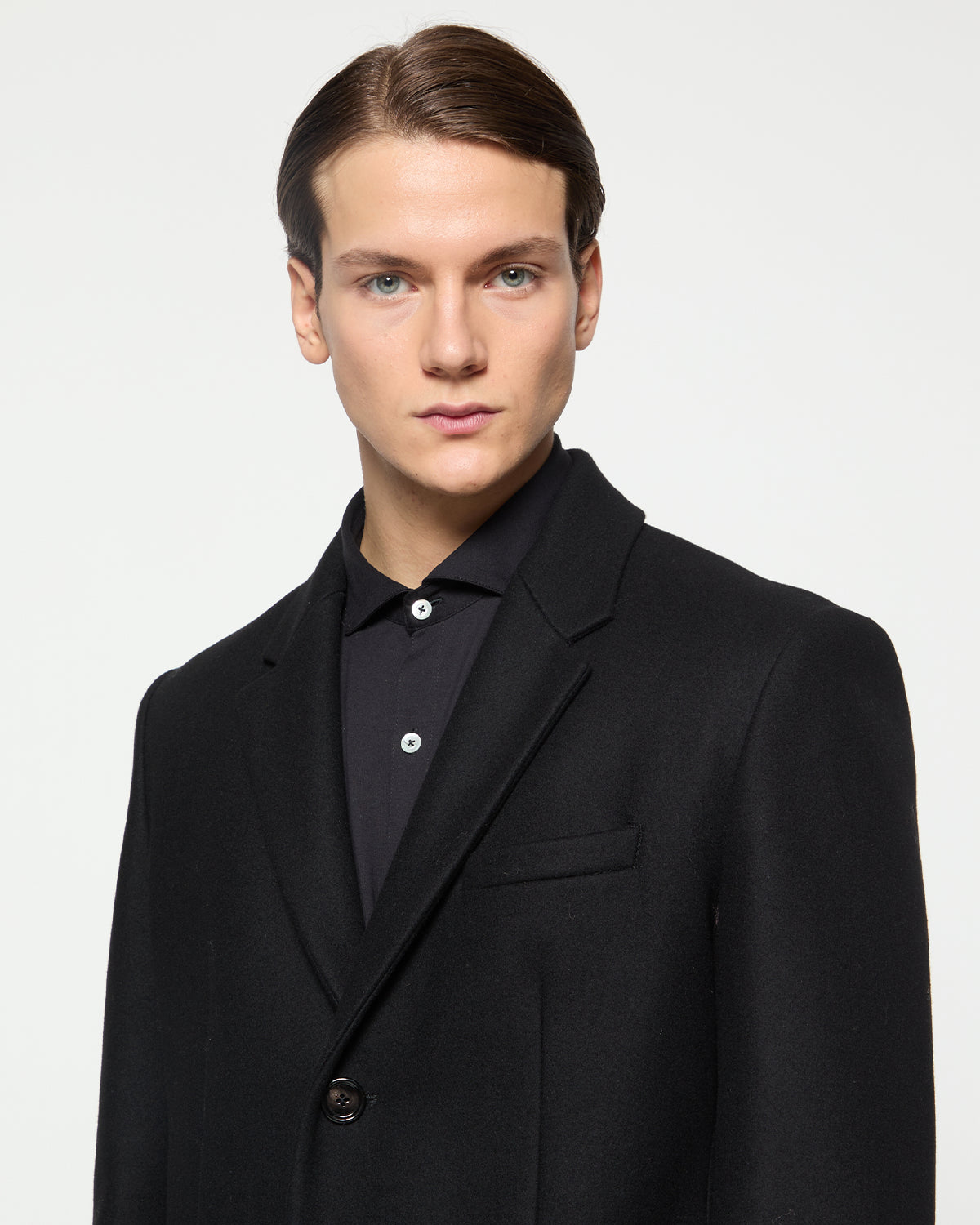 Denne elegante sorte frakke er designet med en klassisk enkeltradet lukning og fremstillet af en luksuriøs blanding af uld og cashmere. Stoffet giver både varme og en sofistikeret struktur, hvilket gør frakken til det perfekte valg til kølige dage. Med sit tidløse design og høje kvalitet er den ideel til både hverdag og formelle anledninger.