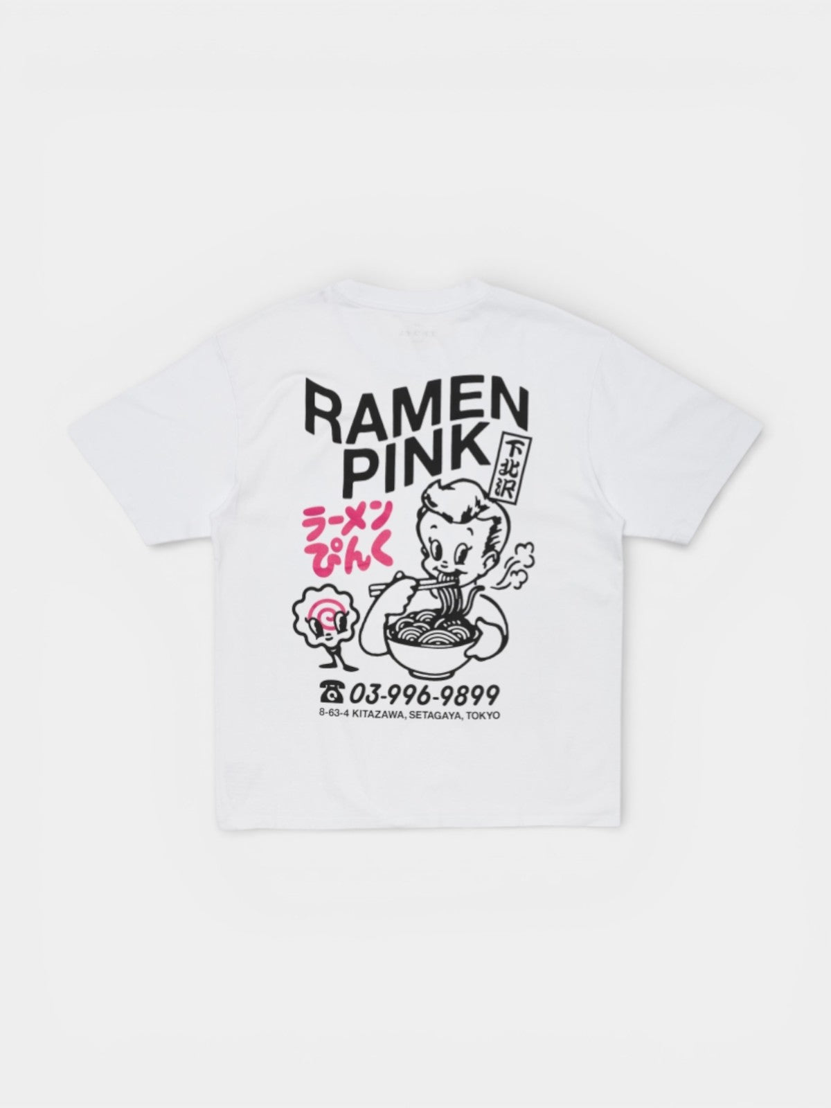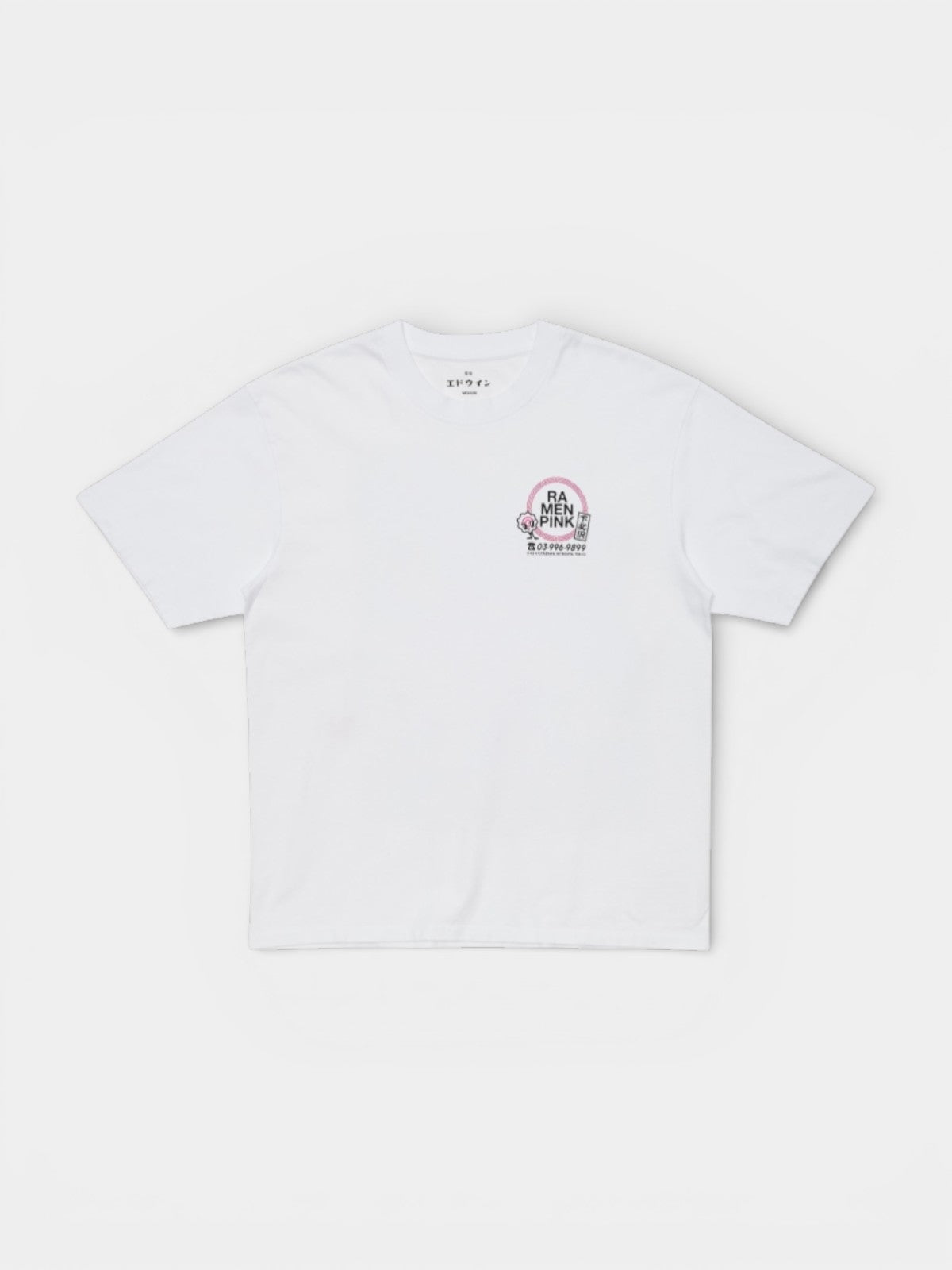 EDWIN Ramen Pink T-Shirt er en oversized T-shirt fremstillet i blød single jersey i 100 % bomuld med en vægt på 160 g/m², hvilket giver en let og behagelig kvalitet til hverdagsbrug. Den har ribkant i halsen og grafiske prints på både bryst og ryg, der giver et markant og moderne streetwear-udtryk. Den afslappede pasform skaber en casual silhuet, mens den rene hvide farve gør T-shirten nem at kombinere med både jeans, shorts og lag-på-lag outfits. Resultatet er en komfortabel og stilfuld T-shirt med fokus på kvalitet, komfort og et grafisk statement-design.