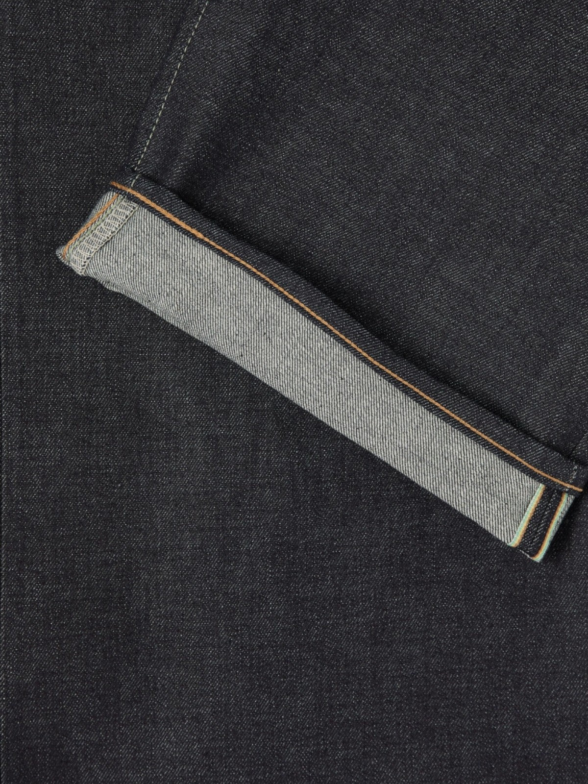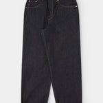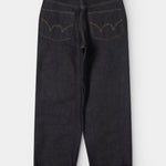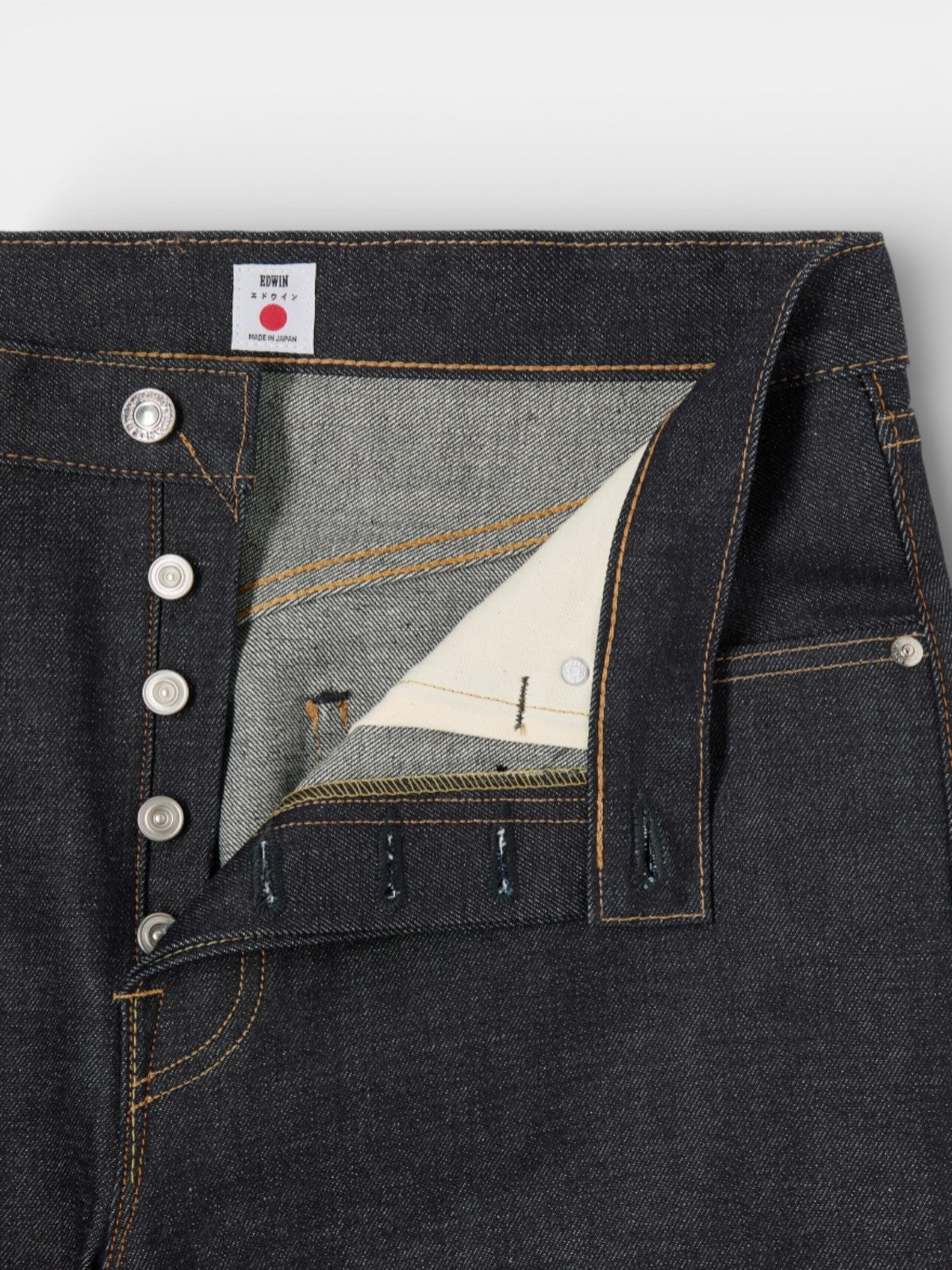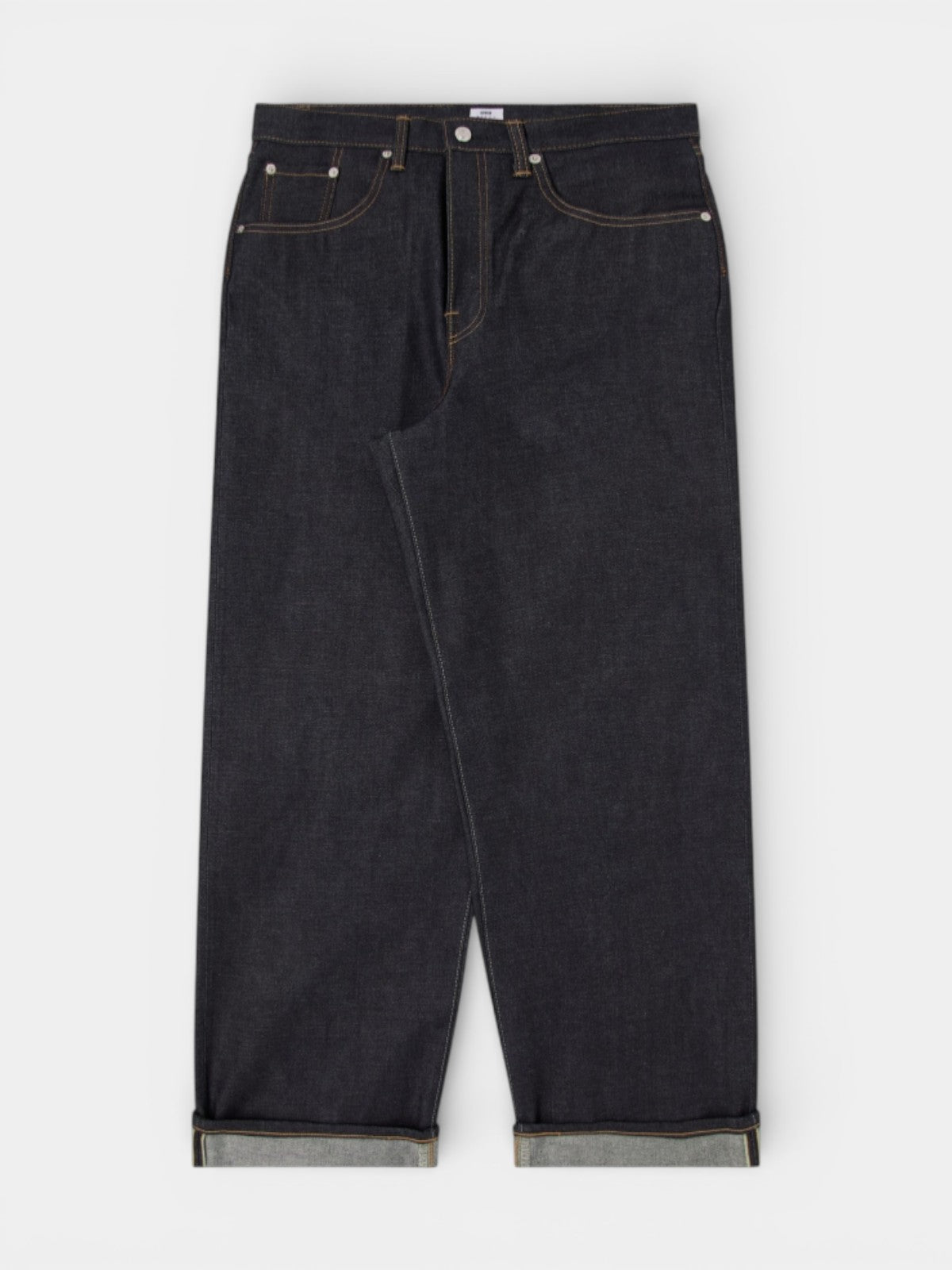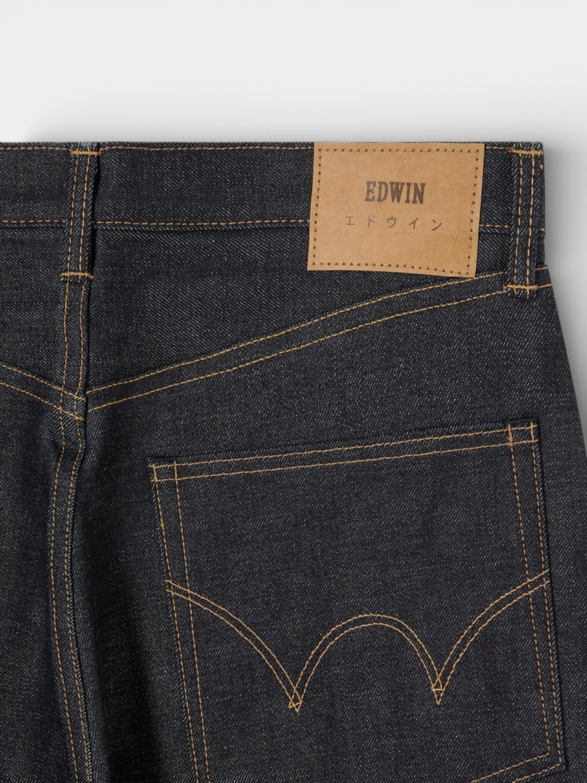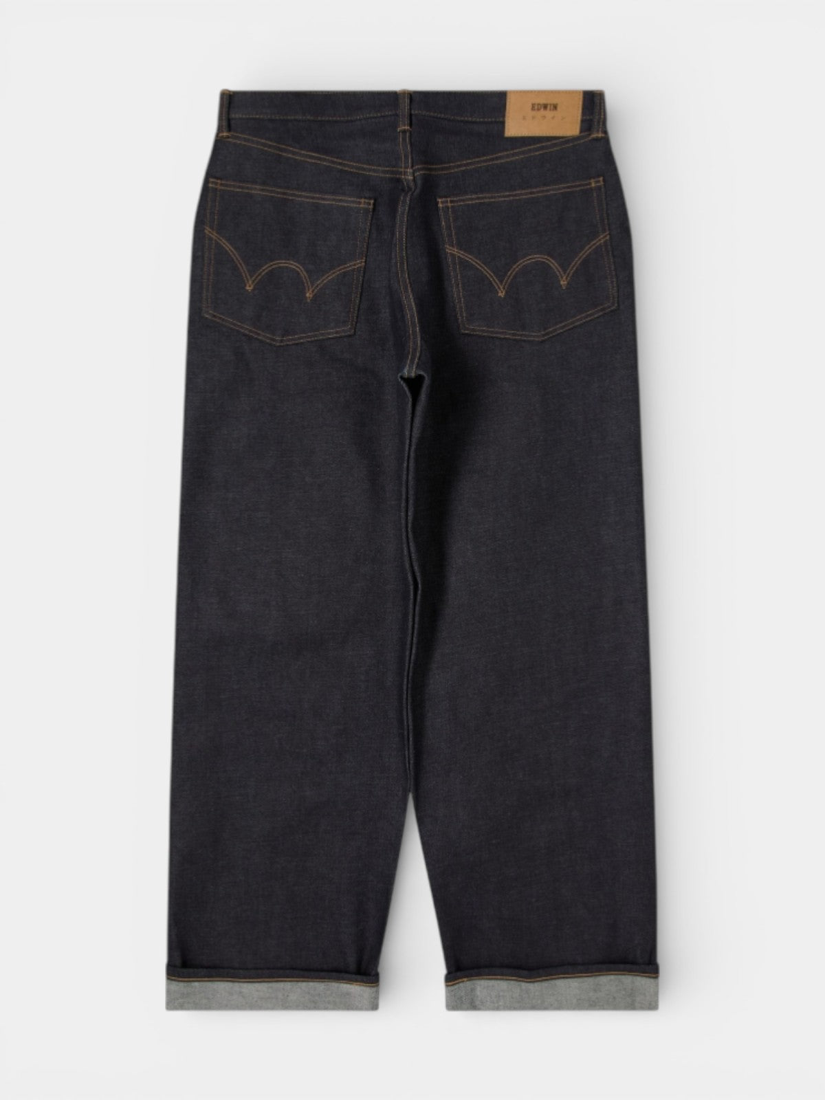 EDWIN Wide Pant er et par jeans med en moderne, oversized silhuet, fremstillet i 13,5 oz Kaihara Dark Pure Indigo rainbow selvedge denim i 100 % bomuld. Den rå, ubehandlede blå farve giver et autentisk denimudtryk, der udvikler karakter og patina over tid, mens den mid- til højtaljede pasform og klassiske femlommersdesign med knaplukning skaber en struktureret, men afslappet silhuet. Den japanske Kaihara-denim er kendt for sin kvalitet og holdbarhed, og de ikoniske rainbow selvedge-detaljer tilføjer et eksklusivt og karakteristisk finish. Bukserne kombinerer traditionelt denimhåndværk med et moderne streetwear-udtryk og er ideelle til et stilrent, afslappet look med fokus på kvalitet og komfort.