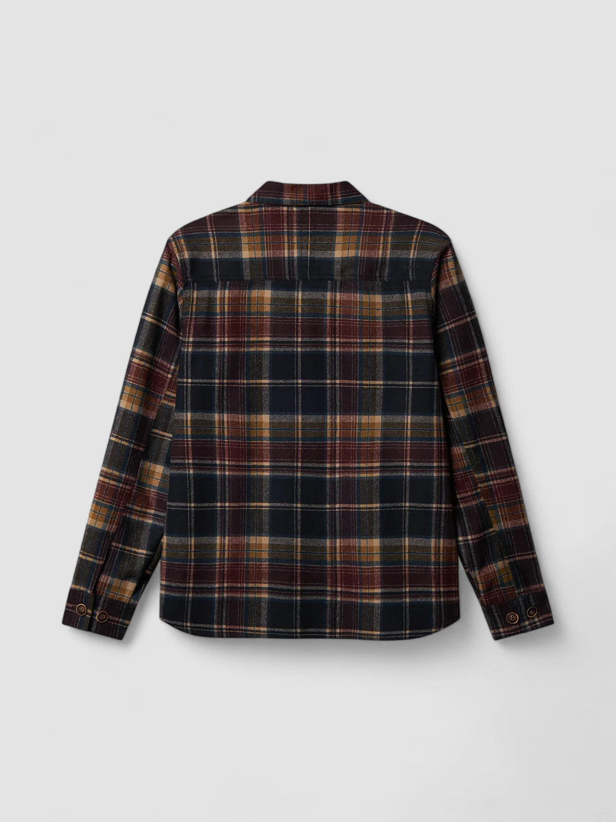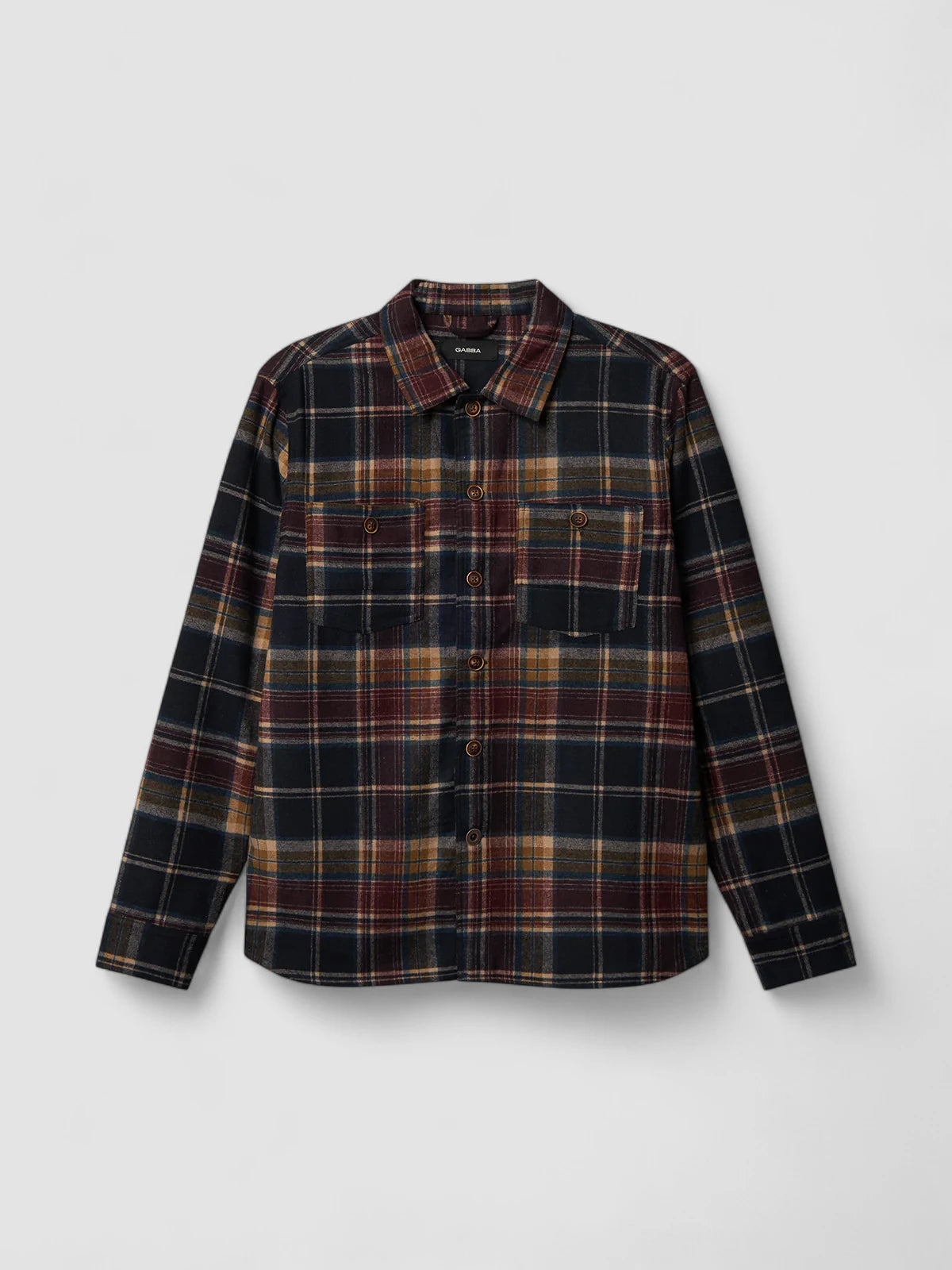 Denne skjorte fra Gabba kombinerer et farverigt Y/D ternet mønster med en let børstet finish for et moderne og behageligt look. De brunlige, falmede knapper tilføjer et vintagepræg, mens den blandede kvalitet af polyester og uld gør den varm og slidstærk – perfekt til køligere dage.