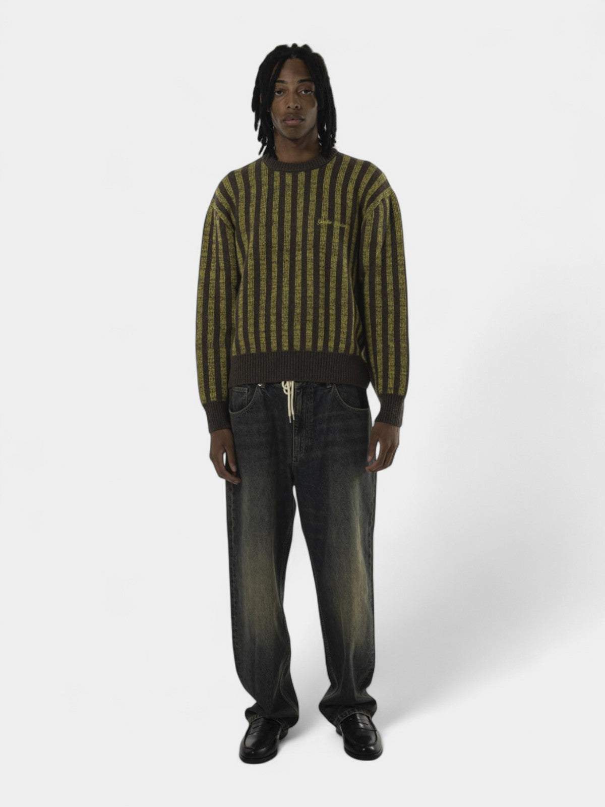 PRE-INTERNET KNIT CASHMERE er en oversized striktrøje, der kombinerer retroinspireret design med moderne luksus. Den varme senneps- og brune stribede farvekombination giver et klassisk udtryk, mens den bløde blanding af uld og cashmere sikrer både komfort og varme. Broderet logo på brystet tilføjer et diskret, grafisk touch. Fremstillet i Portugal, er denne trøje ideel til at tilføre dit outfit et personligt præg, uanset om du er på farten eller slapper af i weekenden.