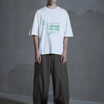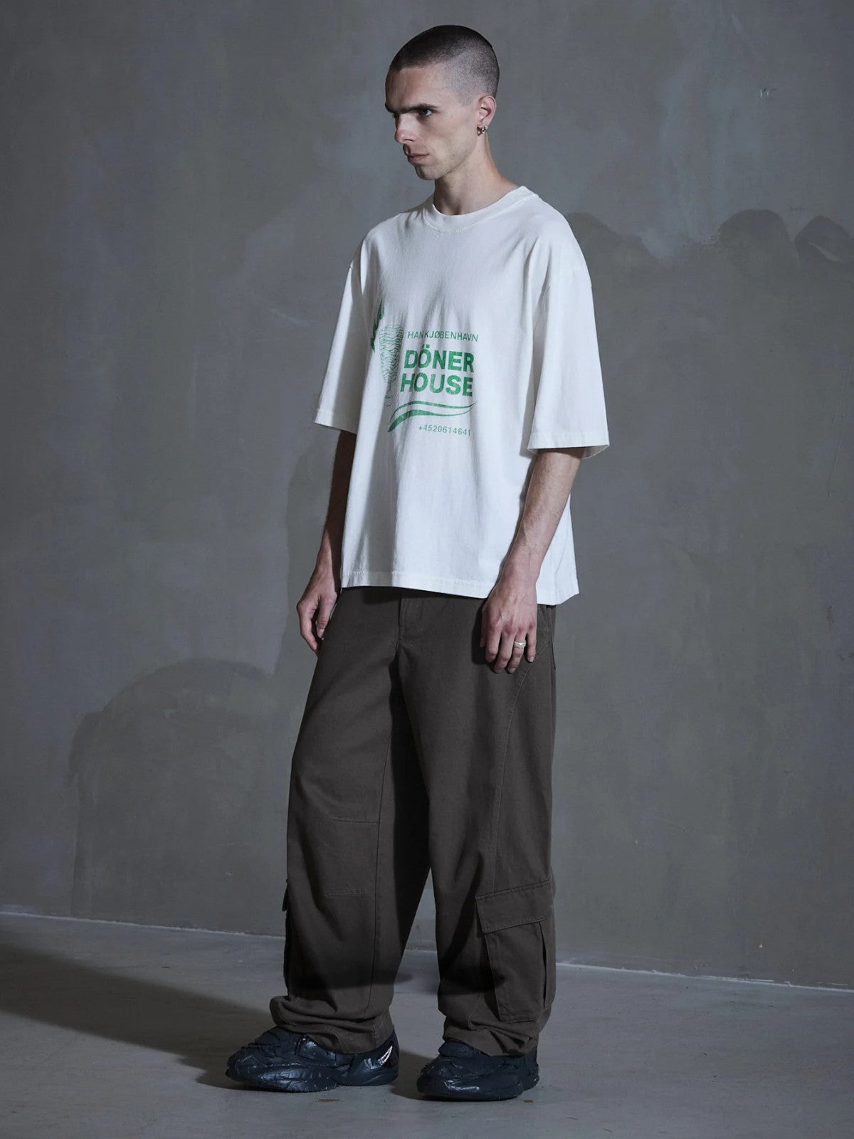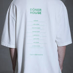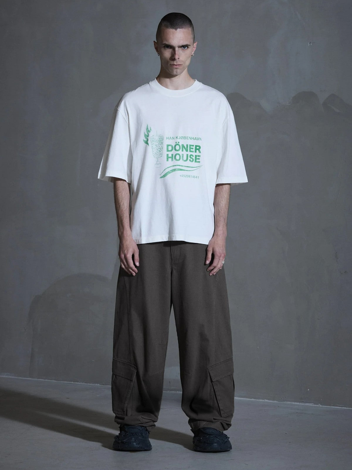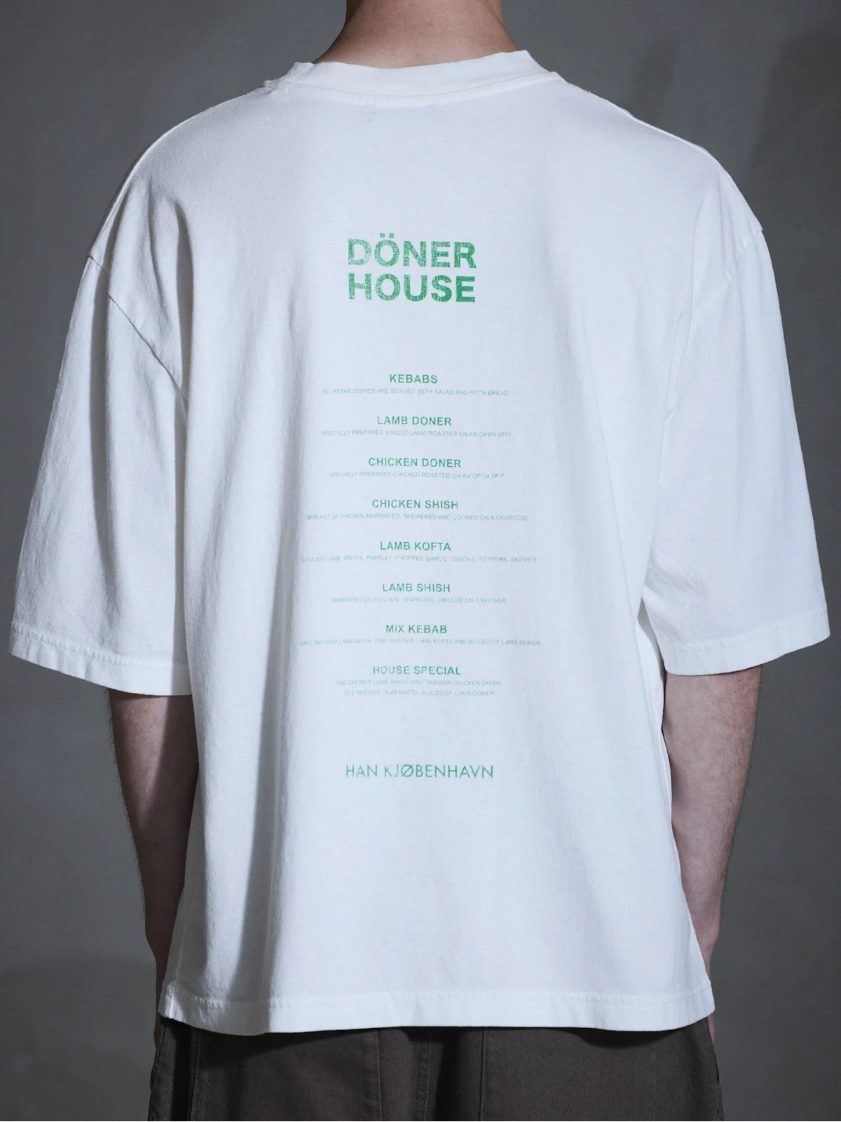 Döner House Oversized Tee i off-white er en afslappet og moderne t-shirt designet med en oversized pasform og droppede Shoulders, der giver en behagelig og street-inspireret silhuet. Den er fremstillet i 100 % bomuld, hvilket sikrer en blød og naturlig følelse mod huden. T-shirten er prydet med et unikt Döner House-print med et ‘cracked’ effekt både foran og bagpå, hvilket tilfører et råt og kunstnerisk udtryk til det minimalistiske design. Den har en 1×1 dobbeltfoldet rib-negl forstærket med fishbone-binding indeni, så den bevarer formen over tid og føles solid i kvaliteten.
