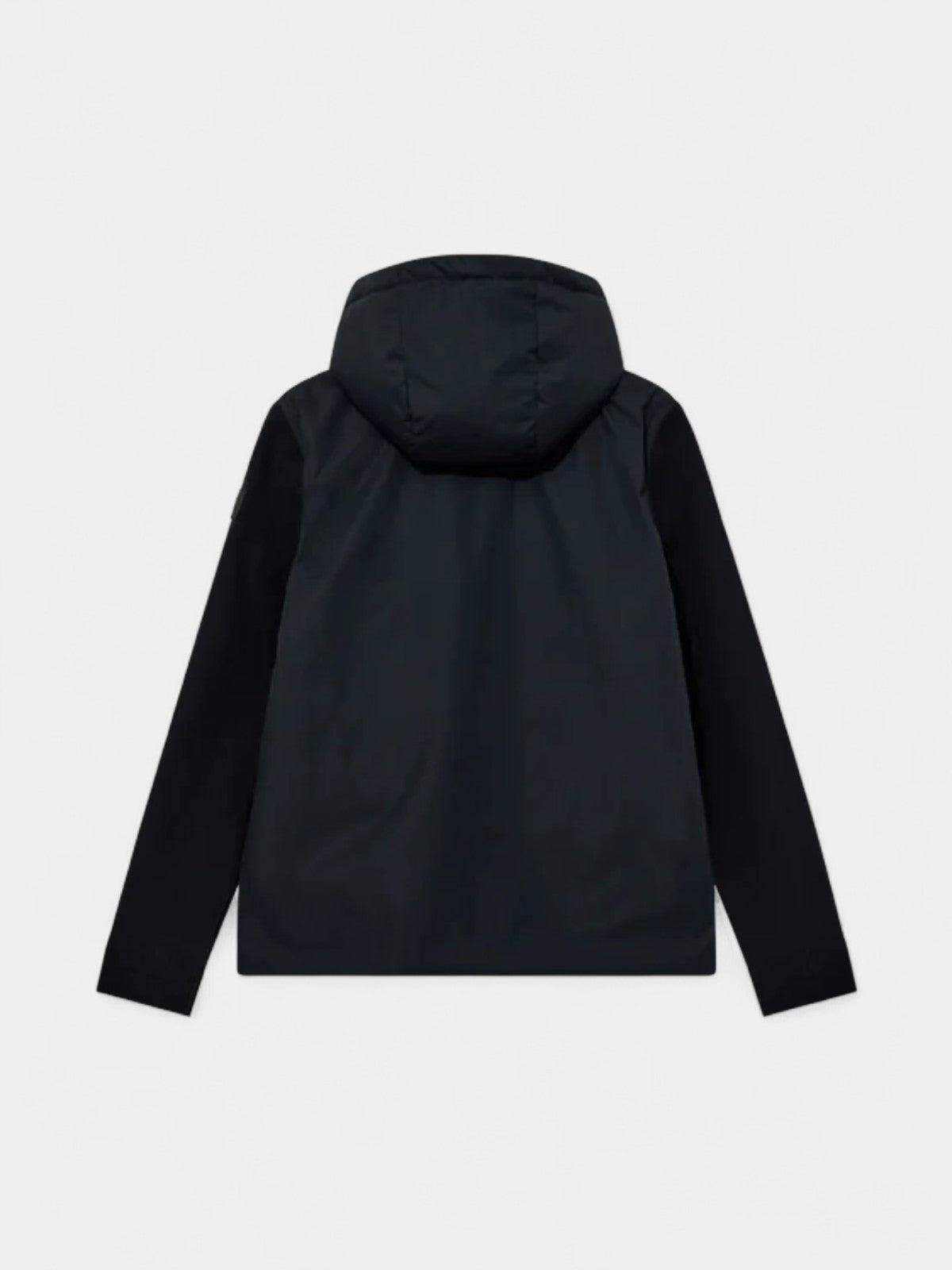 Form og funktion går hånd i hånd i denne sporty jakke med vatteret krop og hætte kombineret med strikkede ærmer. Den regulære pasform, lynlås og praktiske lommer gør den ideel til overgangsvejr. Et moderne og funktionelt valg til den stilbevidste mand.