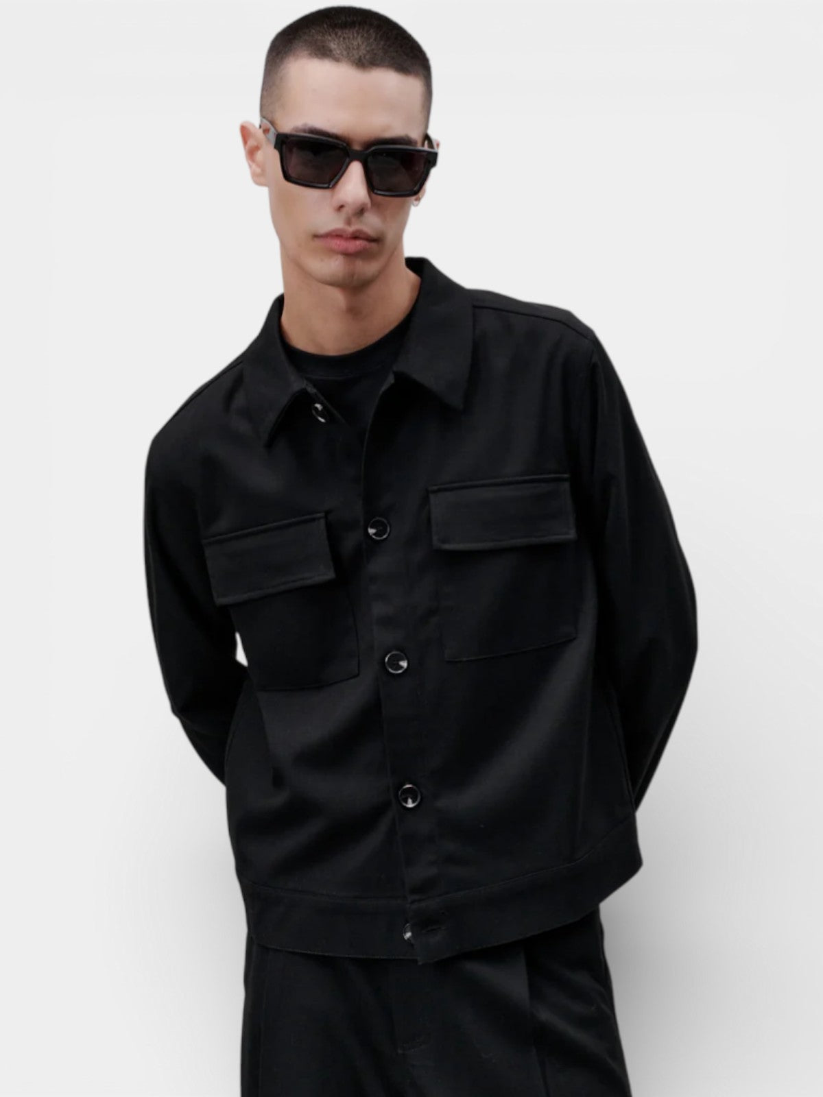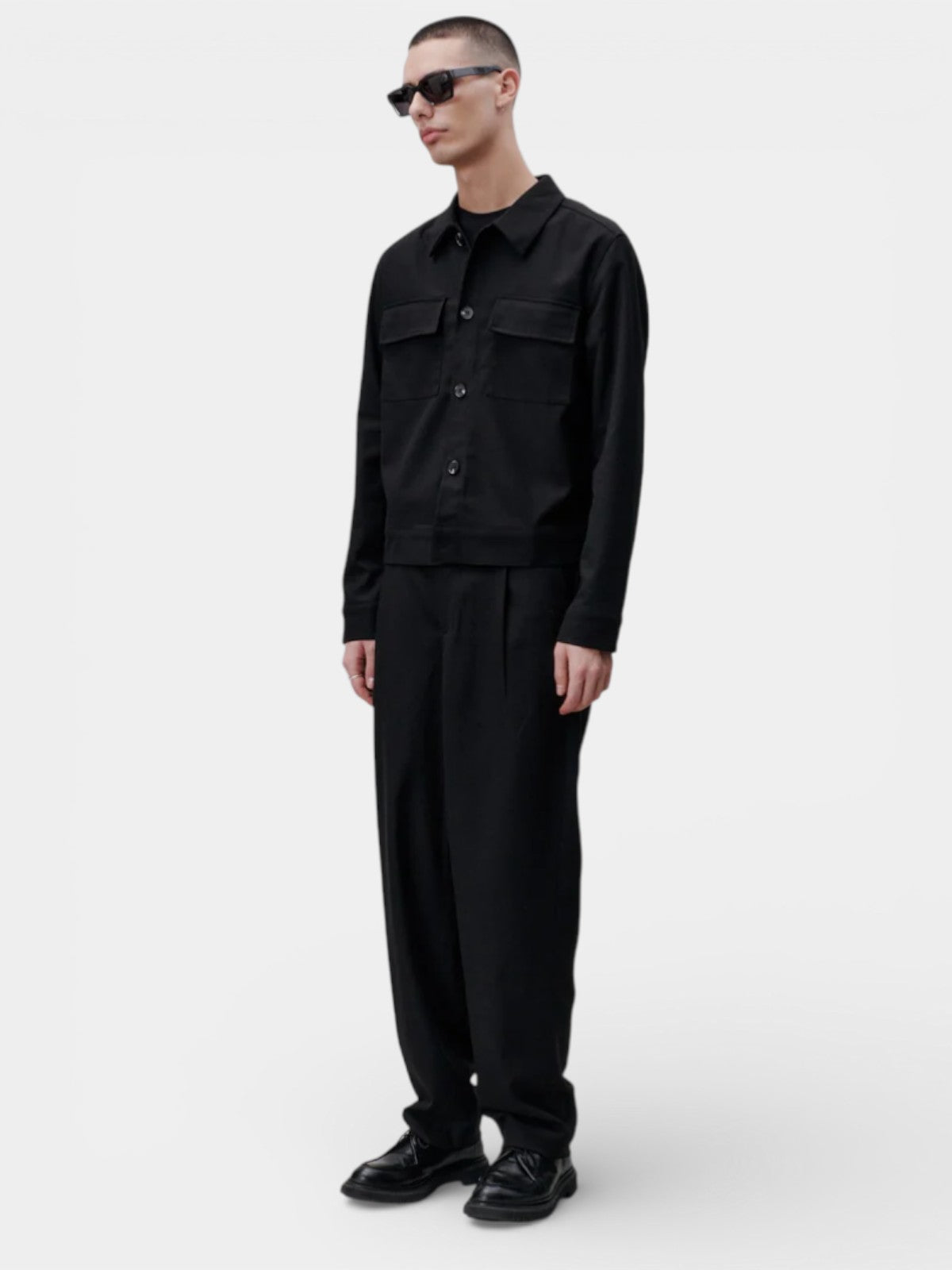 Mind Jacket fra Libertine-Libertine er skåret i et tungt twillstof og fungerer som et stilfuldt alternativ til en klassisk jakke. Den har krave, brystlommer med klap og sidelommer integreret i sidesømmene, hvilket giver både funktionalitet og et rent, moderne udtryk. Materialeblandingen består af 60 % polyester, 18 % viscose, 10 % tencel, 10 % uld og 2 % elastan, som sikrer både struktur, komfort og bevægelsesfrihed.