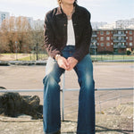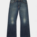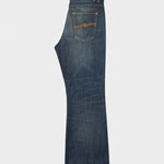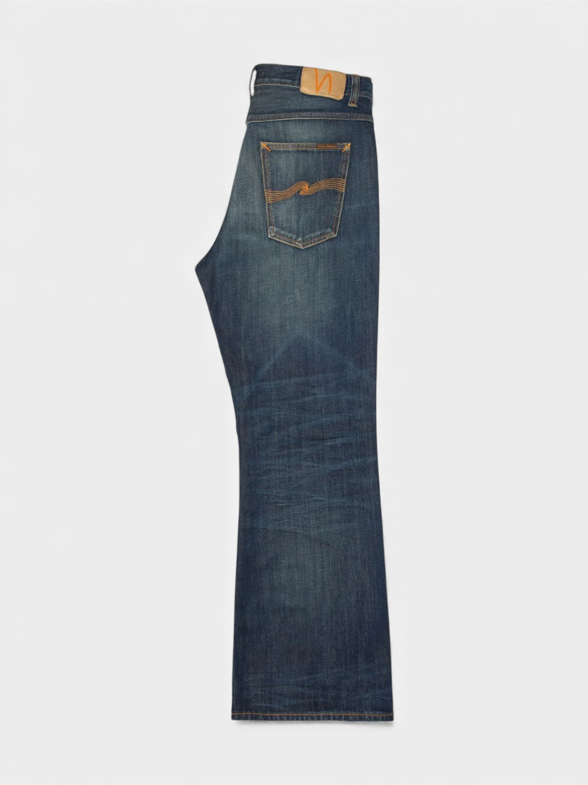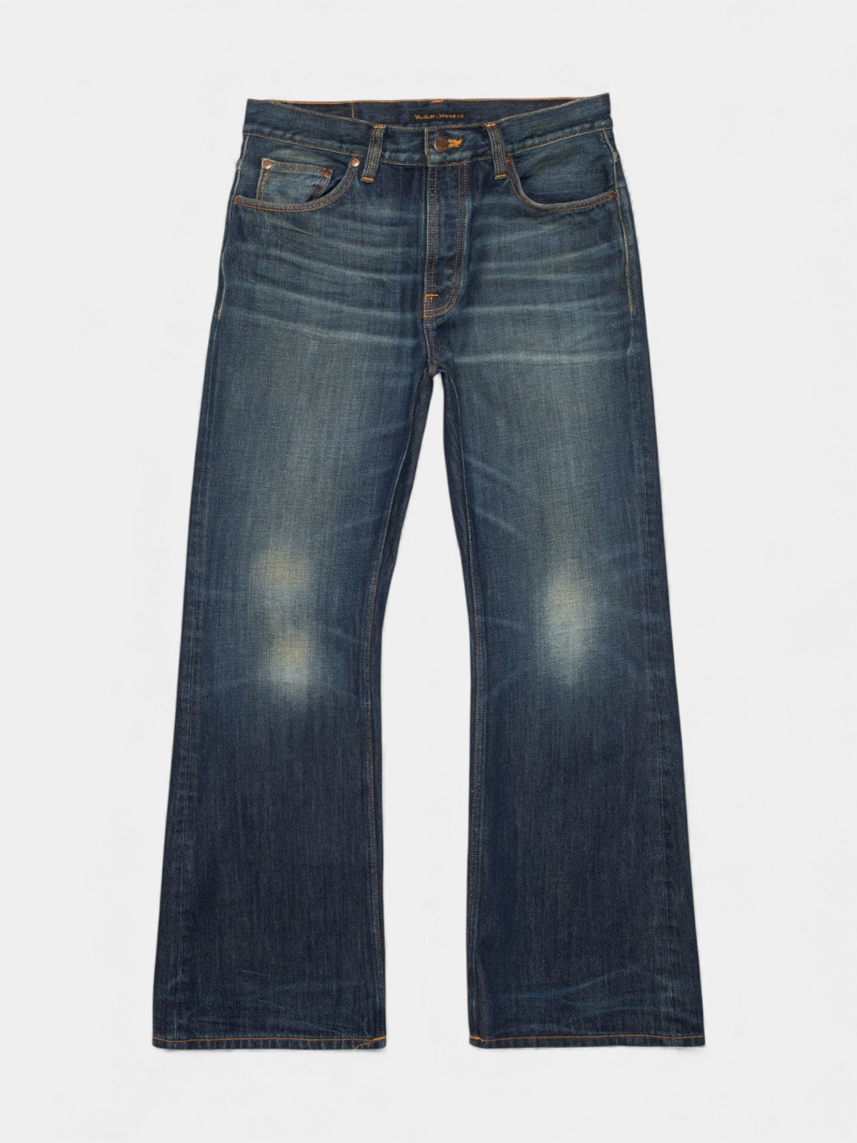 Flare Glenn Old News er et par mid-waist jeans med regular fit og markant flare-ben fra Nudie Jeans. Modellen er lavet i den karakterfulde “Old News”-vask, som kendetegnes ved en dybt mættet mørk bundfarve kombineret med tydelige highlighter-effekter og et let grønligt skær, der giver et råt og nedtonet udtryk. Denne særlige vask fremhæver denimens naturlige struktur og giver bukserne et levende og teksturrigt look. Pasformen sidder behageligt over hofterne og omkring lårene, mens benvidden gradvist åbner sig forneden og skaber den klassiske flare-silhuet. Resultatet er et par jeans med et stærkt, selvsikkert udtryk, der både kan styles råt og mere stilrent afhængigt af anledningen.