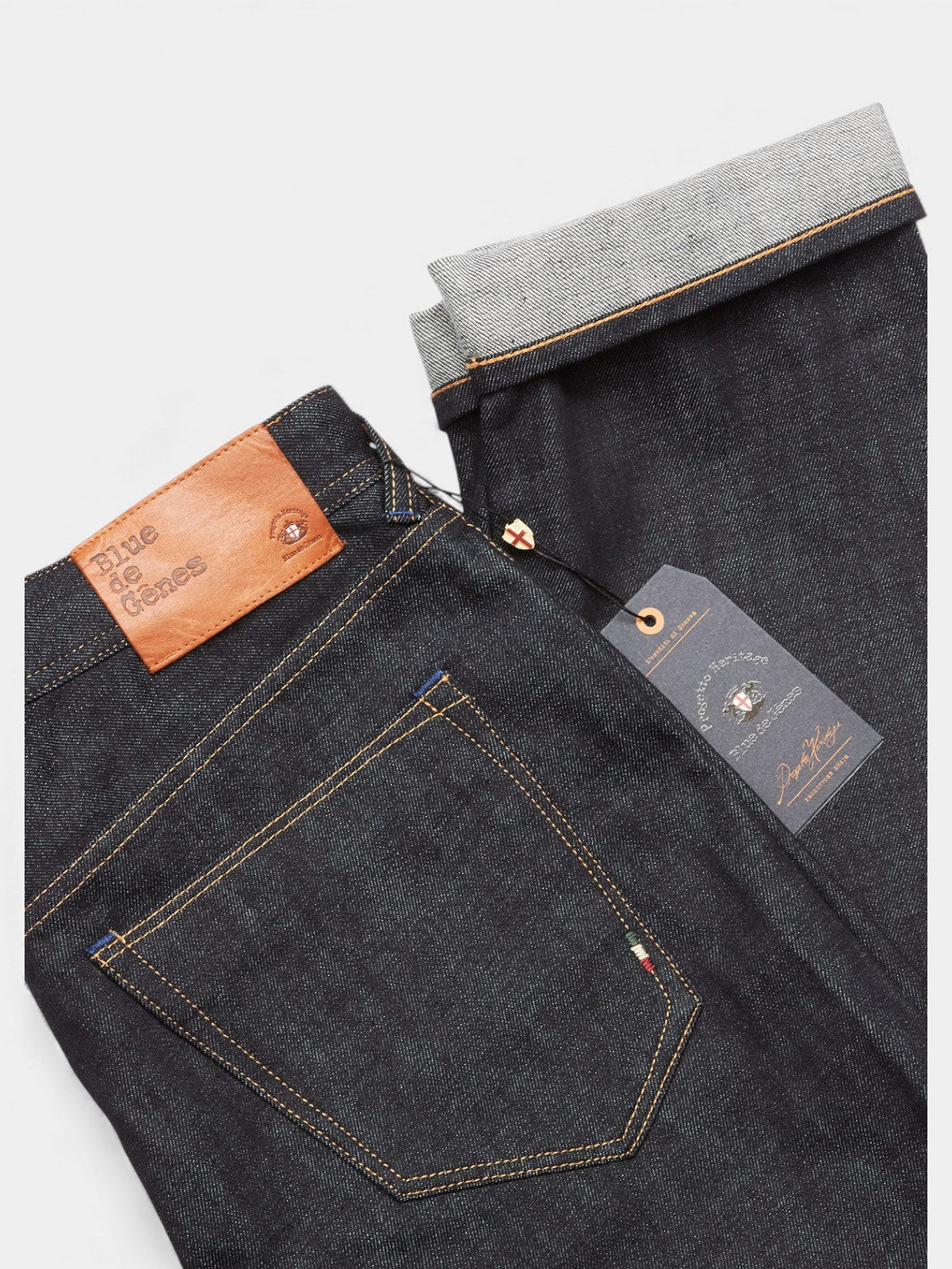Giacomo Selvedge Jeans – Raw Denim fra Blue de Gênes er klassiske, italiensk fremstillede jeans i stiv, ubehandlet 12 ¾ oz bomuldsdenim, der med tiden får en unik patina. De har en løs, komfortabel pasform med smallere ben, fem lommer, metalknapper med branding og subtile detaljer som italiensk flagbroderi og Blue de Gênes‑flag. Inspireret af Genovas havnearbejdere kombinerer de robusthed, tidløst design og høj kvalitet.