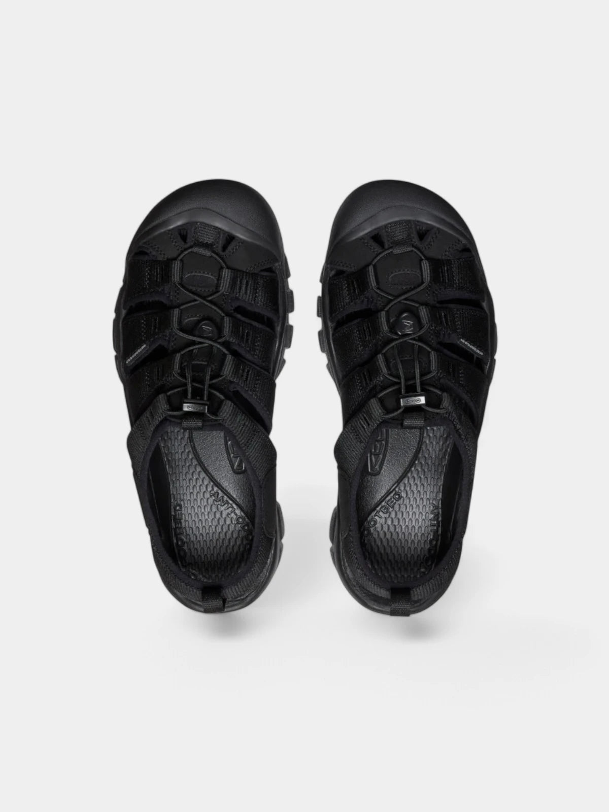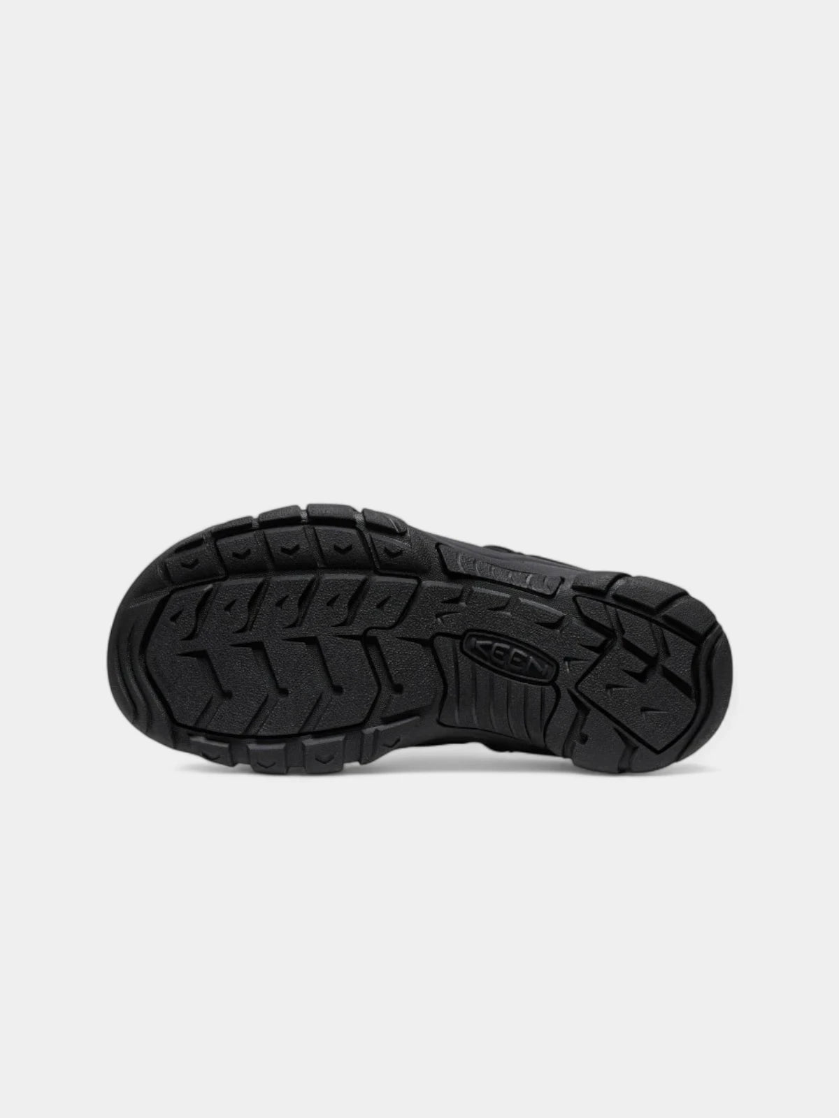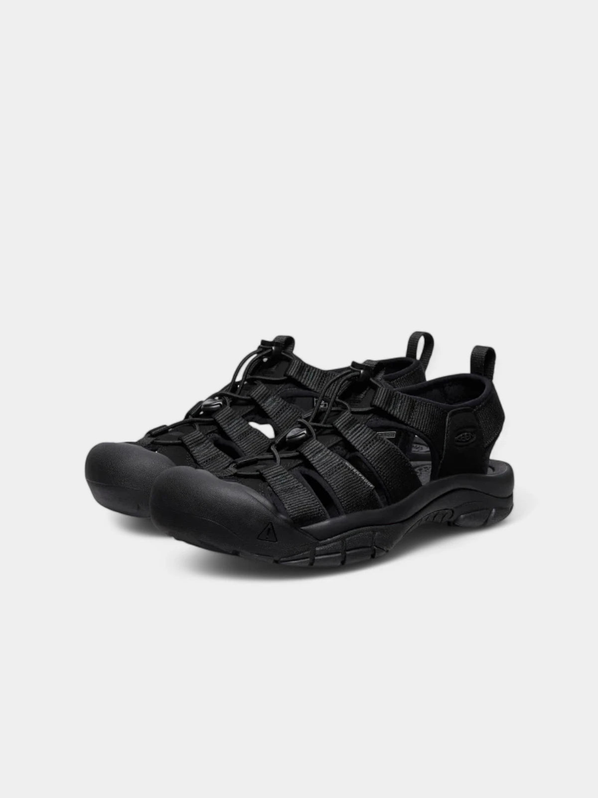 KEEN´s Newport H2 Triple Black er en hybridsandal, der kombinerer støtte og beskyttelse med komfort og åndbarhed. Den vaskbare polyesterwebbing tørrer hurtigt, mens den patenterede tåbeskyttelse giver ekstra sikkerhed i ujævnt terræn. Et elastisk snøresystem sikrer en god pasform, og EVA-indersålen giver let stødabsorbering. Gummiydersålen med mønster sikrer godt greb på både tørre og våde overflader.