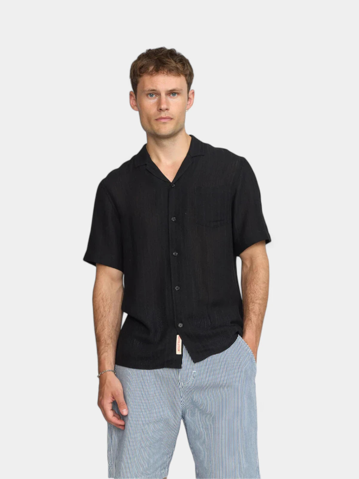 Cuban shirt fra Revolution er lavet af et let og åndbart materiale, hvilket gør den ideel til varme dage. Med sin klassiske cubanske krave og afslappede pasform giver skjorten et stilfuldt og uformelt look. Den blå farve er både alsidig og tidløs, hvilket gør det nemt at style skjorten til både afslappede og mere elegante anledninger. Skjorten har en praktisk brystlomme og en knaplukning, som giver et simpelt, men funktionelt design. Perfekt til afslappede weekender eller feriedage, hvor både komfort og stil er vigtig.