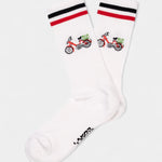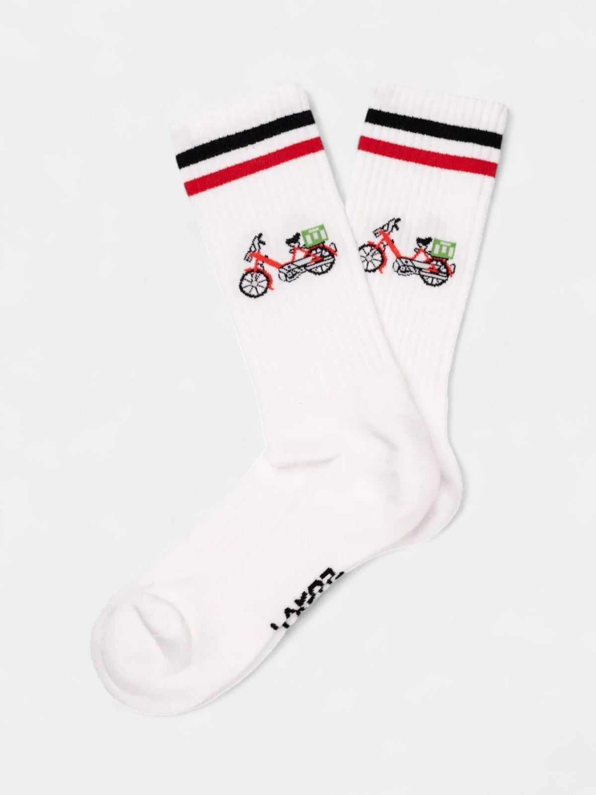 Red Maxi Socks hylder Puch Maxi-cyklen som et symbol på menneskelig ukuelighed og industriel arv. Strøget med et detaljeret vævet motiv der fanger øjet, omfavner sokken foden med en kombination af blødhed og elastisk komfort, mens forstærkede partier ved tå og hæl sikrer holdbarheden. Tynde, åndbare paneler giver ventilation og sørger for, at foden kan holde sig tempereret hele dagen. Sokken er fremstillet af 70 % økologisk bomuld, 27 % polyamid og 3 % elastan, og den produceres i Portugal med omtanke for både kvalitet og ansvarlig produktion. Vask ved 40 grader.