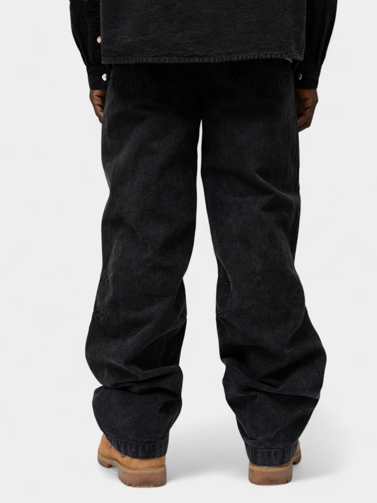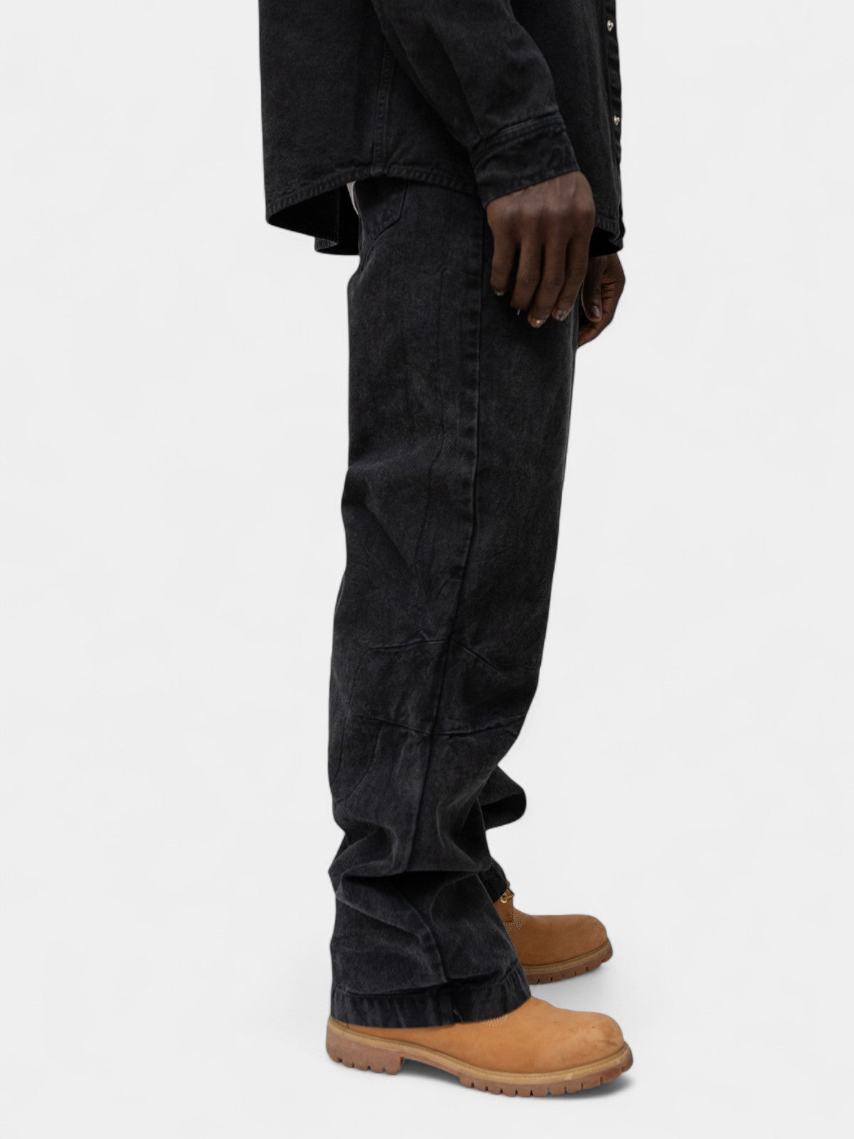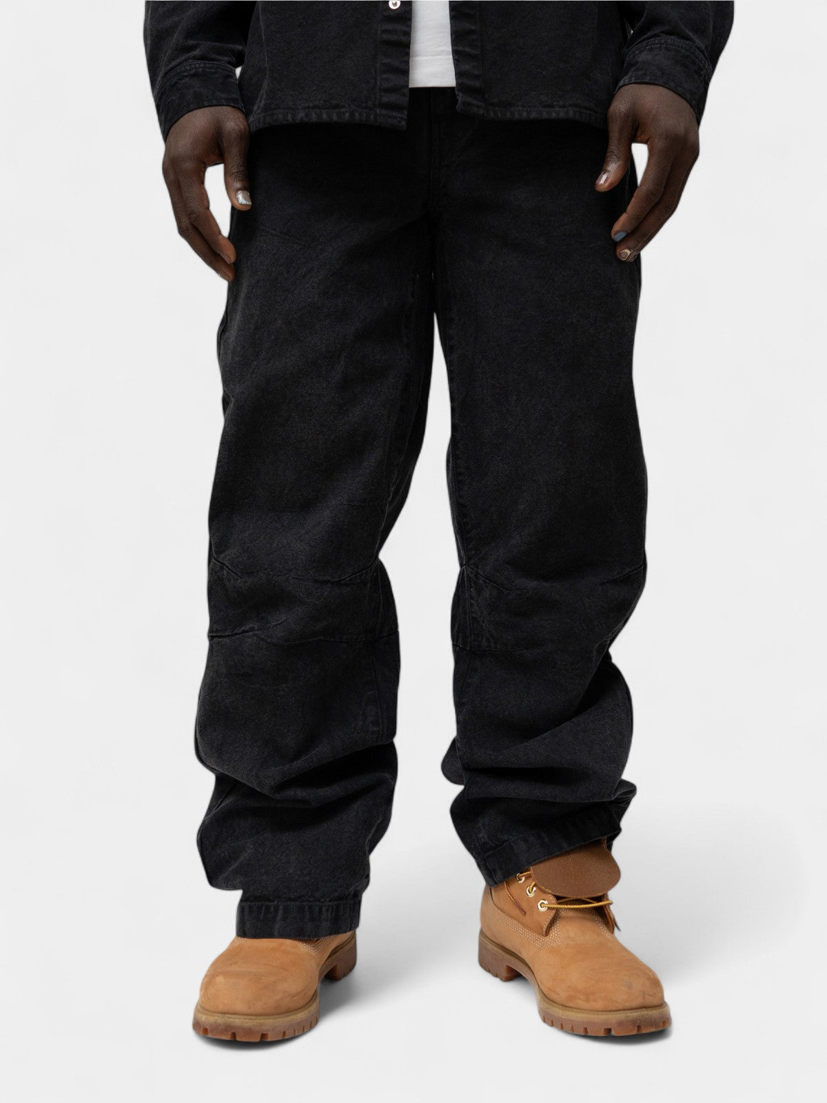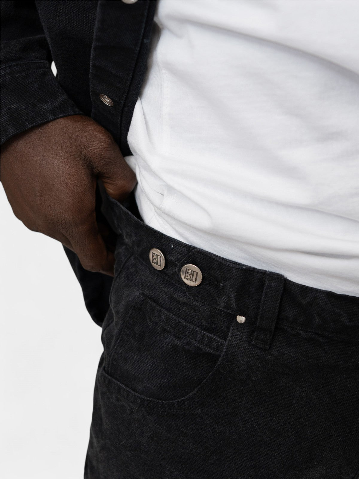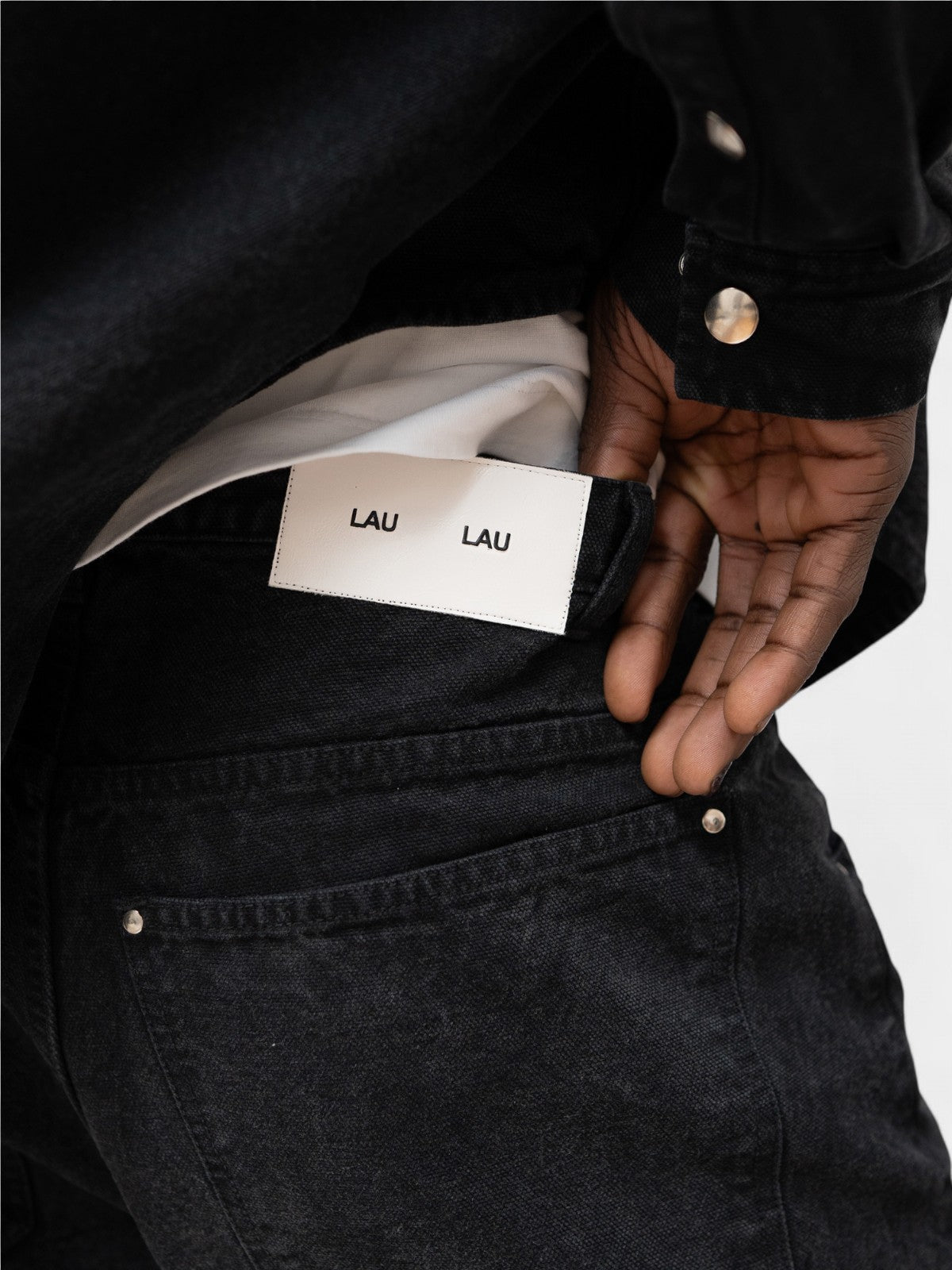 Lau Lau's Canvas Pants kombinerer funktionalitet og stil i et minimalistisk design. Fremstillet i Portugal af 14 oz dead stock canvas, består de af 100 % bomuld og har en vaskeblød, sort nuance. Bukserne har en justerbar talje for optimal pasform.