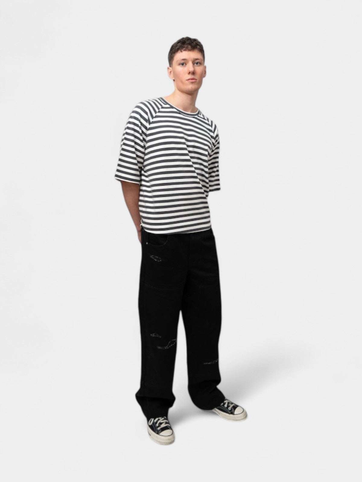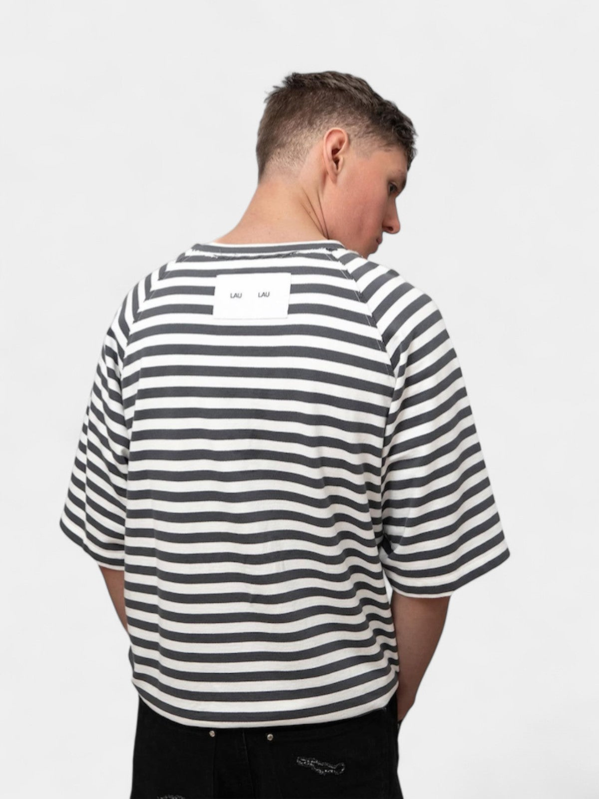 Den stribede tee fra LauLau kombinerer klassisk stil med et råt twist. T-shirten er hvid med grå striber og har slidte detaljer, der giver den et vintage-inspireret og afslappet udtryk. Den let oversized pasform og bløde bomuldskvalitet gør den både behagelig og nem at bruge i hverdagen.