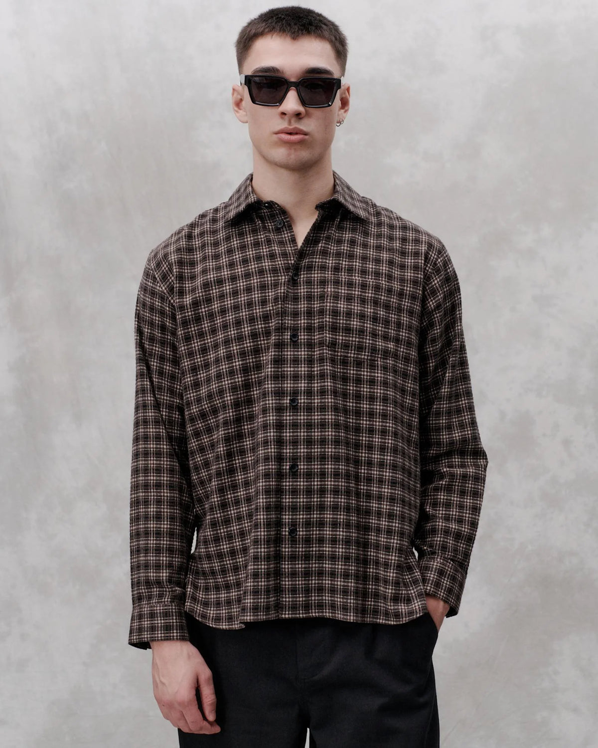 Record 3641 fra Libertine-Libertine er en afslappet, men elegant skjorte i et blødt børstet stof med brune tern. Den er fremstillet af kvalitetsmaterialer vævet i Italien og syet i Portugal, hvilket giver et eksklusivt og holdbart udtryk.