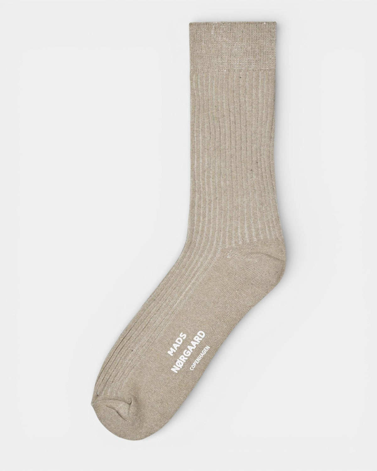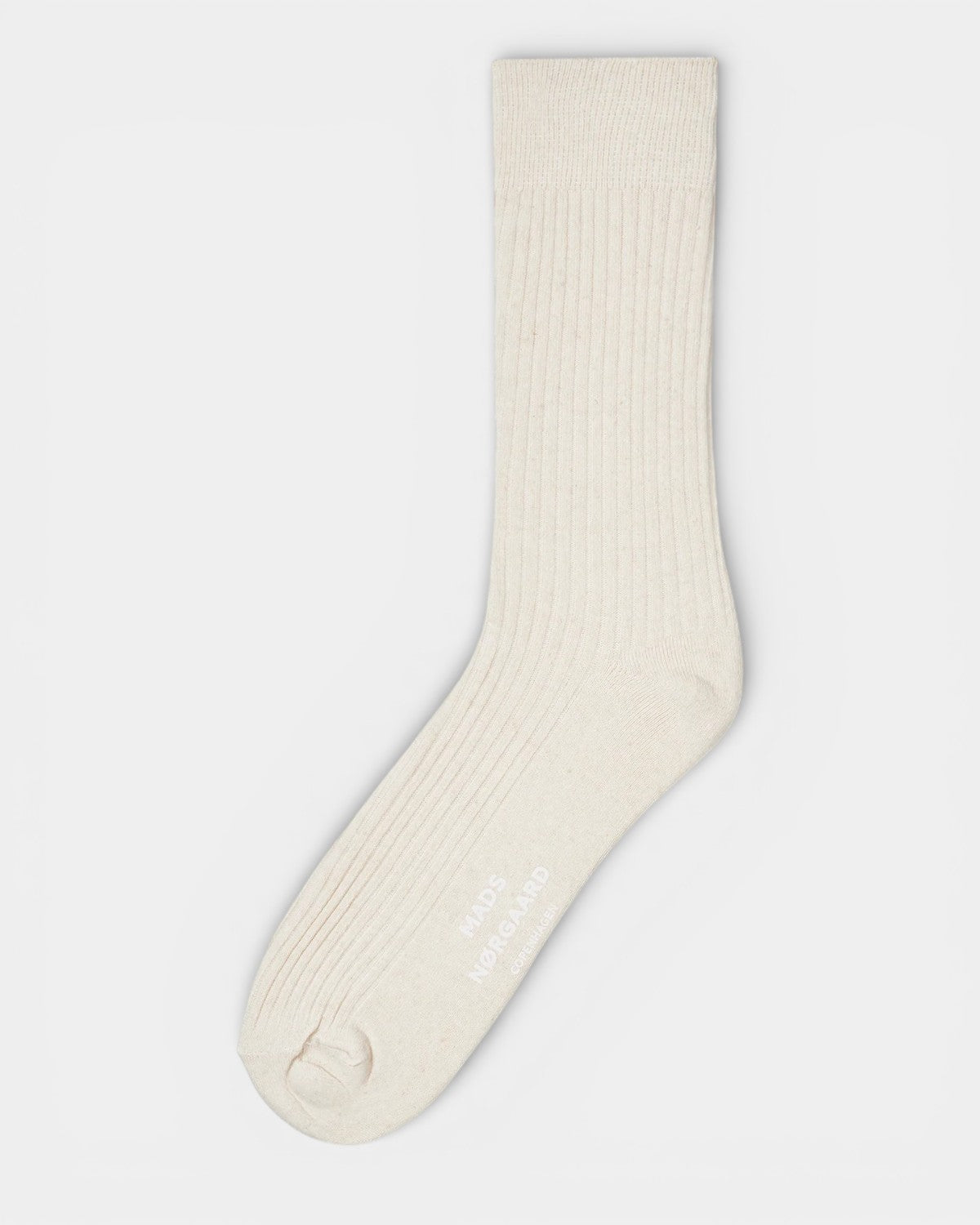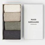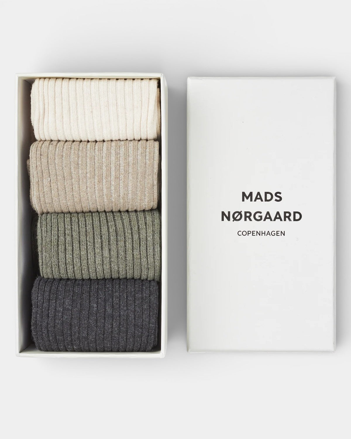 Sock Box Anton fra Mads Nørgaard er et sæt med fire par ribstrikkede strømper i forskellige farver, designet til at give både komfort og alsidighed i hverdagen. Strømperne er lavet i en blød bomuldsblanding med genanvendt bomuld, polyester og elastan, hvilket sikrer en behagelig pasform og holdbar kvalitet. Denne sokkebox er ideel som en praktisk opgradering af garderobens basics og fungerer lige godt til både hverdagens sneakers og mere afslappede sko.
