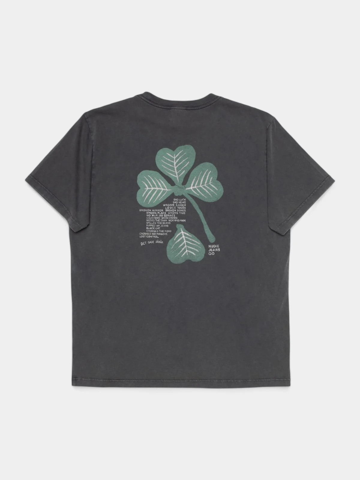 Roy Lost Leaf Tee i antracit fra Nudie Jeans er en enkel T-shirt med rund hals, lavet af 100% økologisk bomuld. Den har et diskret print på brystet og et større motiv på ryggen, som tilføjer et moderne præg. Den stonewash-behandlede bomuld giver en blød og worn-in fornemmelse, der gør den ideel til at styles med denim. Pasformen er regular, hvilket giver en komfortabel og klassisk silhuet.