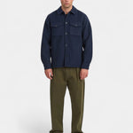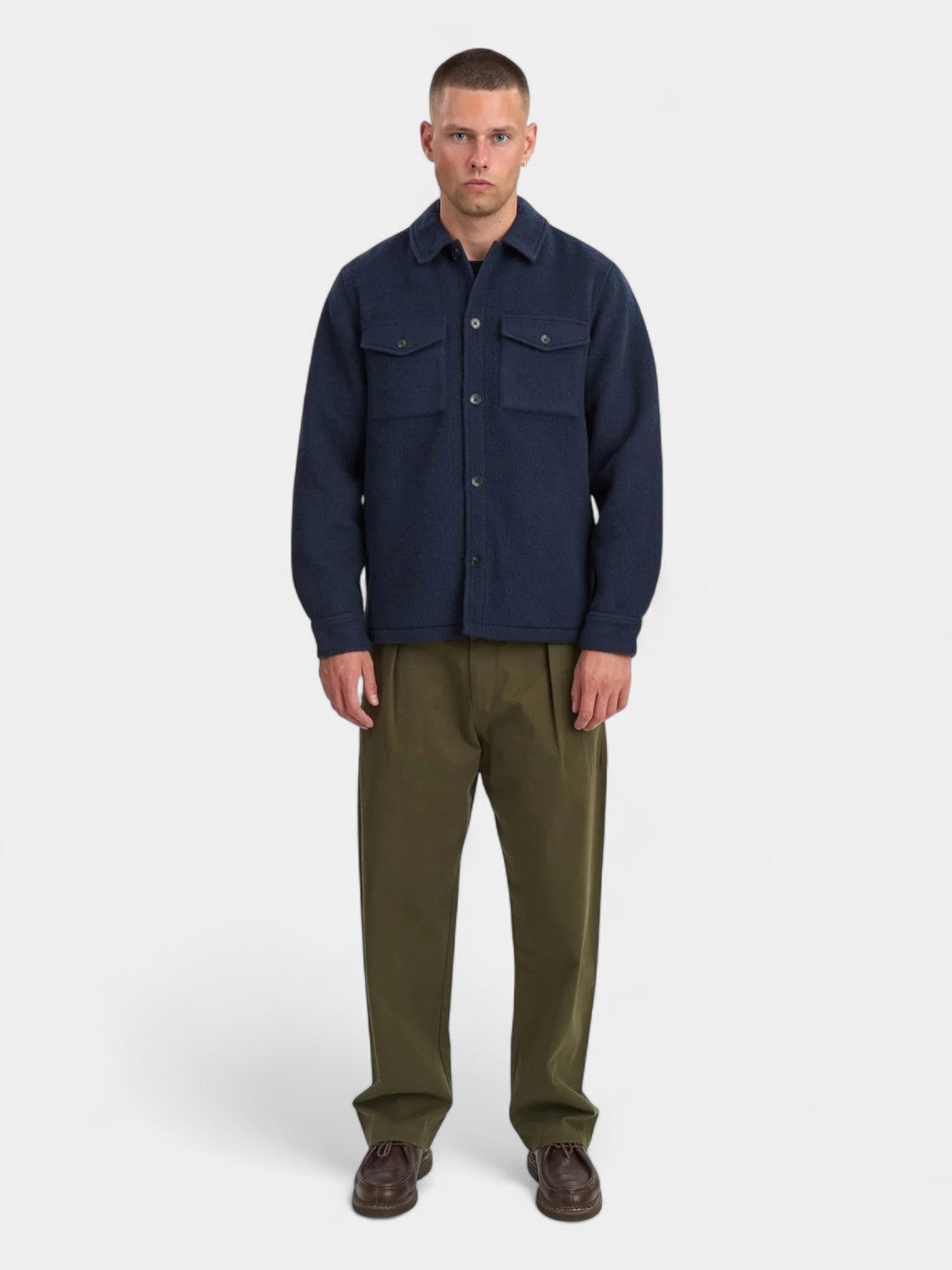 Akleif Boiled Wool Overshirt – Sky Captain er en raffineret overshirt i dyb blå nuance, designet til både at blive båret alene og som et stilfuldt ekstra lag. Den er fremstillet i en solid blanding af 50 % uld og 50 % polyester, hvilket giver materialet en blød følelse, god struktur og varme egenskaber. Overshirten har klassiske skjortedetaljer med krave, gennemknapning og manchetter, mens snittet holder en behagelig, let oversize pasform, der nemt kan tones ned med chinos. For at bevare stoffets kvalitet og farve anbefales vask på uldprogram, på vrangen og med lignende farver; tumbletørring og optiske blegemidler bør undgås for at mindske risikoen for krympning.