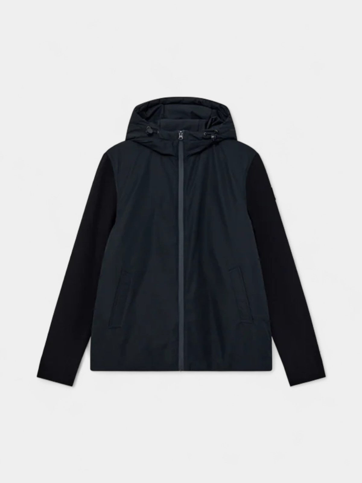 Form og funktion går hånd i hånd i denne sporty jakke med vatteret krop og hætte kombineret med strikkede ærmer. Den regulære pasform, lynlås og praktiske lommer gør den ideel til overgangsvejr. Et moderne og funktionelt valg til den stilbevidste mand.