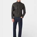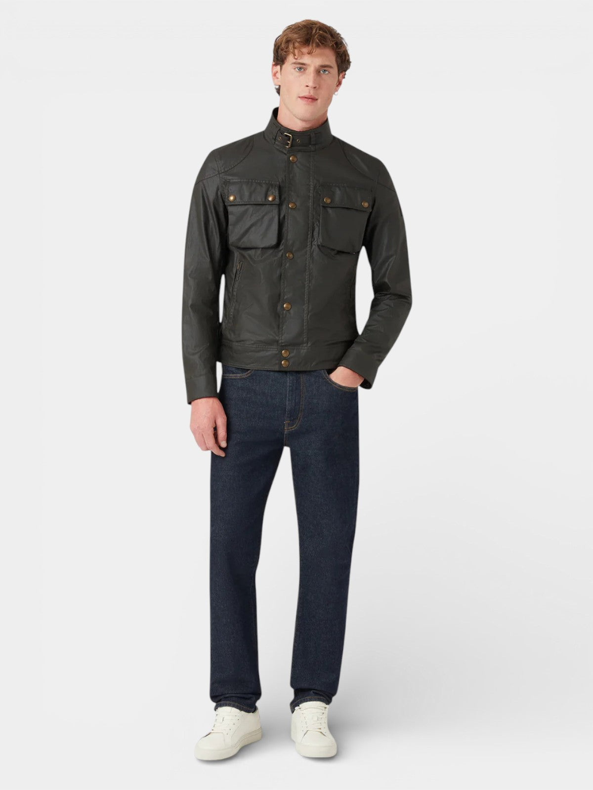 Belstaff Racemaster Jacket i Fader Olive forener klassisk britisk design med funktionel ydeevne. Den er syet i slidstærk, vand- og vindafvisende 6 oz. voksbehandlet bomuld, som giver en beskyttende og fleksibel overflade til hverdagsbrug. Jakken har en slank, moderne pasform med komfortable kordfløjlspaneler ved krave og manchetter samt forstærkede detaljer for ekstra holdbarhed.