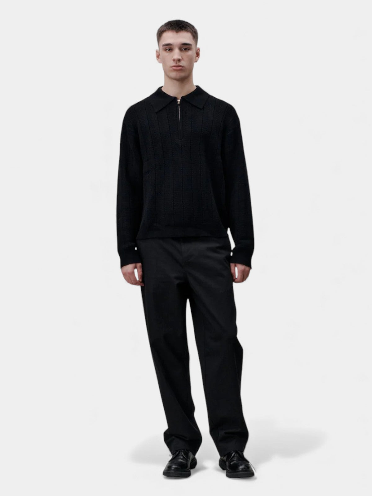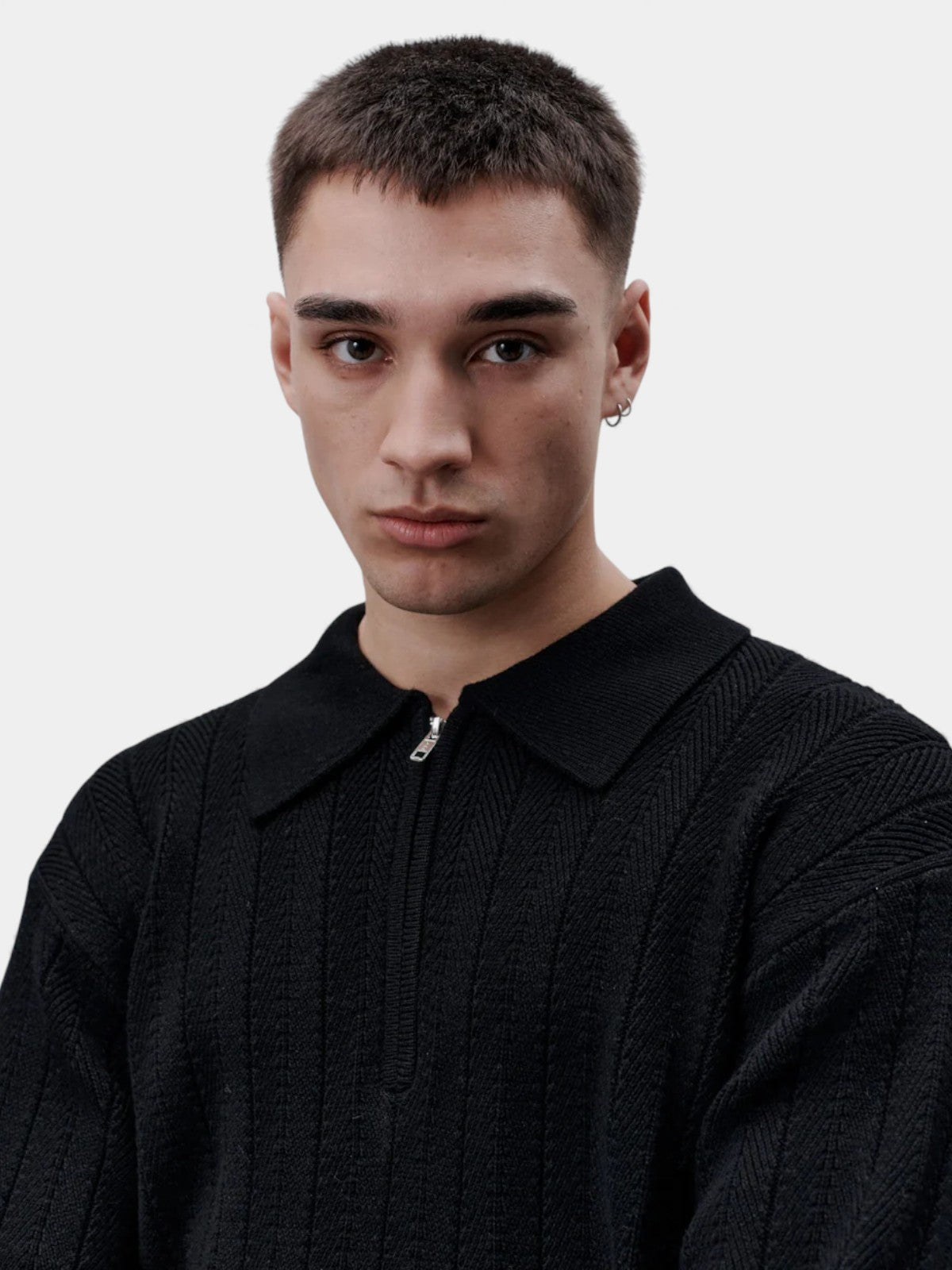 Scent 3651 i sort er en oversize strik med half zip og krave, designet i en struktureret sildebensstrik, der giver et eksklusivt og moderne udtryk. Den kraftige 7-gauge strik skaber en solid fornemmelse, mens ribkanter ved ærmer og bund sikrer en flot pasform og høj komfort. Modellen er lavet i en blød og balanceret kvalitet af bomuld og uld, som føles behagelig mod kroppen og samtidig holder faconen flot. Designet er skabt til en afslappet, oversize silhuet, der fungerer perfekt både alene og som et lag-på-lag element i garderoben.