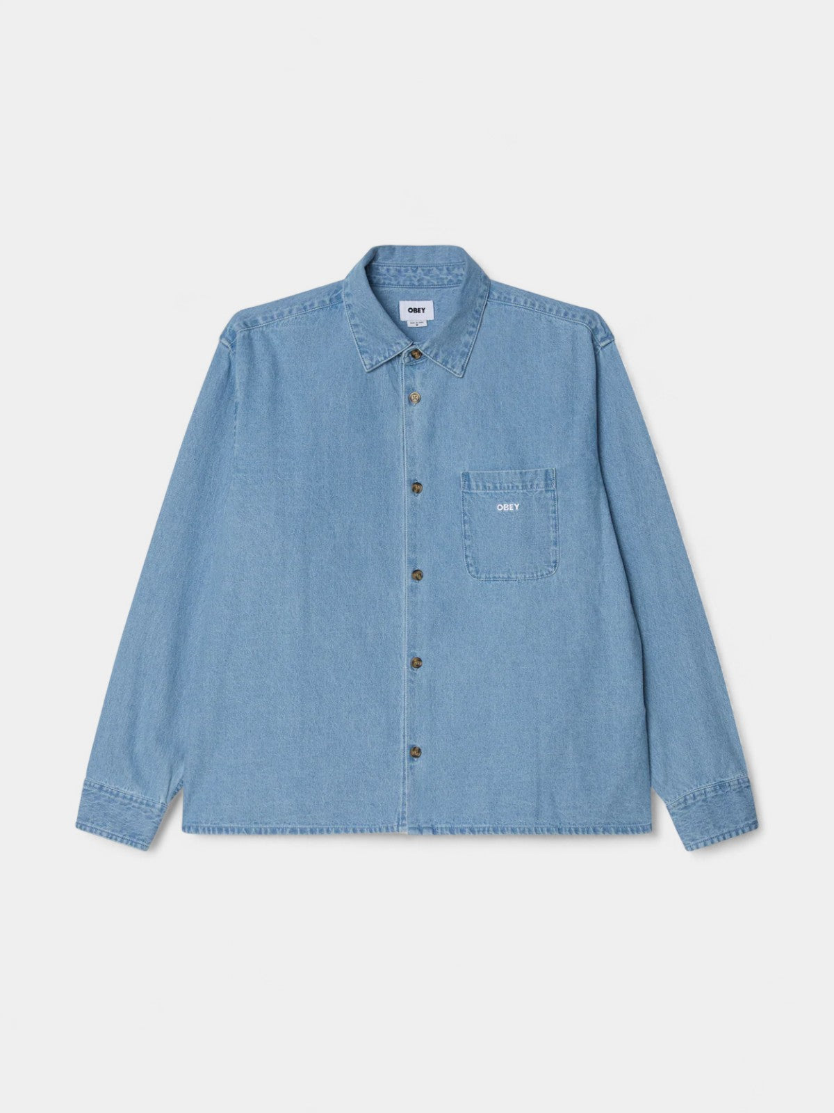 Pablo Denim Shirt fra Obey er en afslappet skjorte med fuld knaplukning foran og en brystlomme. Skjorten er broderet med logo på brystet og har et lige forstykke nederst (straight hem). Den er fremstillet i 100 % bomuld og har “relaxed fit” – mere løs og komfortabel.