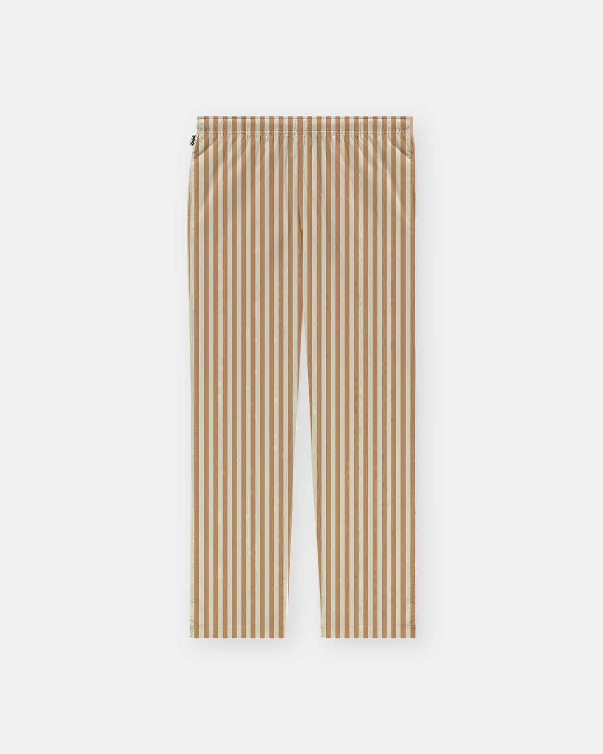 Disse Beigestribede pyjamasbukser er lavet af 100% GOTS-certificeret økologisk bomuld, hvilket gør dem både bæredygtige og utrolig behagelige. Med en afslappet pasform, to praktiske lommer og et unisex-design er de perfekte til både afslapning og pyjamasfester.