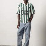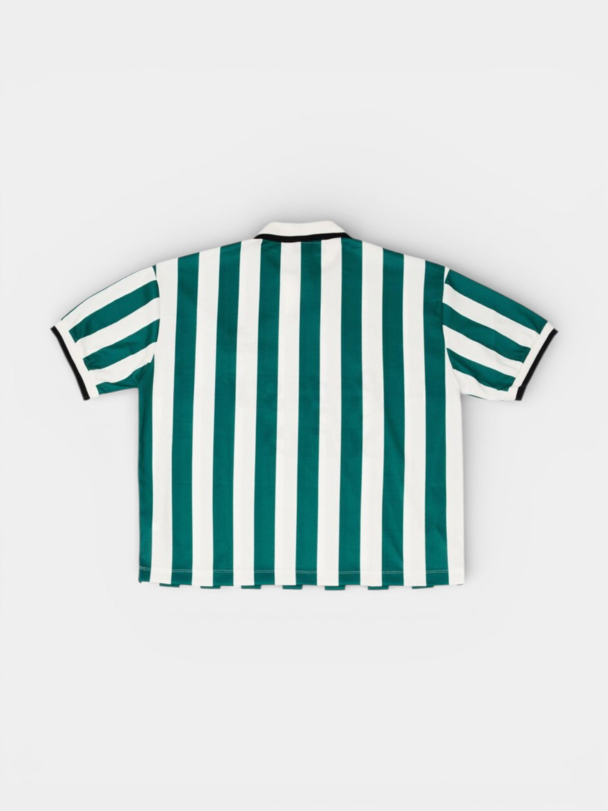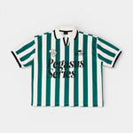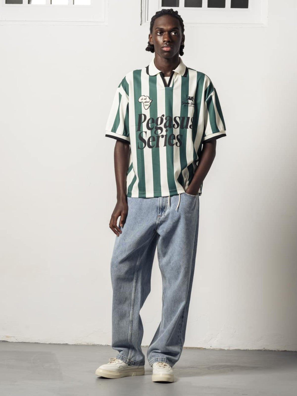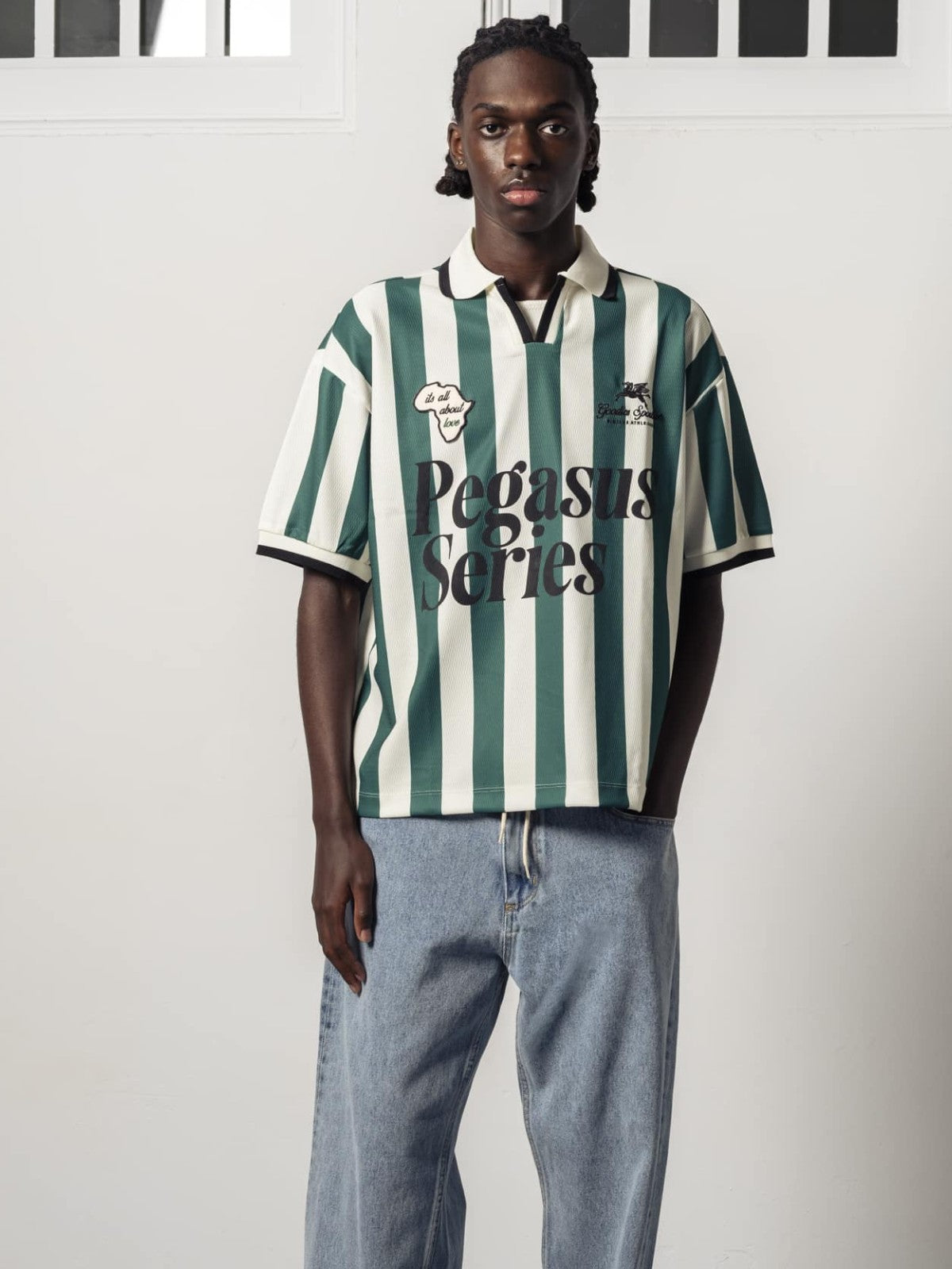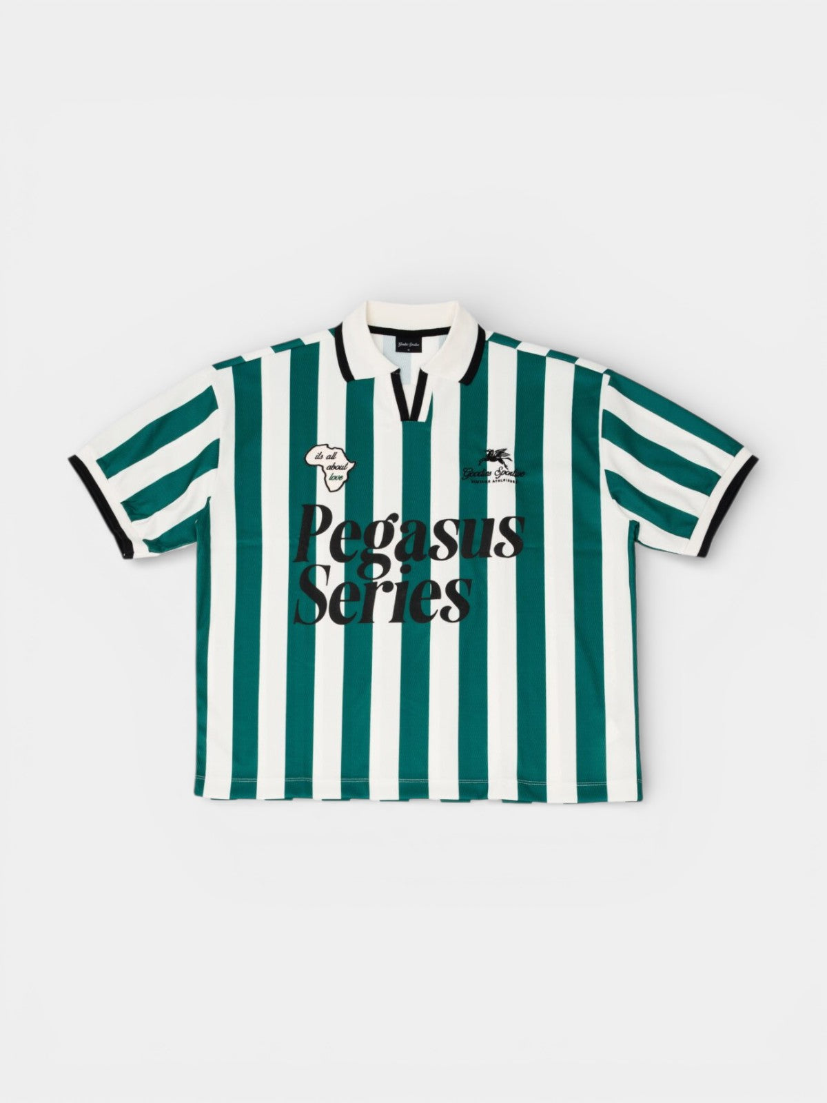 About Love Football Tee er en grøn og ecru stribet football‑inspireret T‑shirt fra Goodies Sportive med et sort Pegasus‑serie‑print, Goodies Sportive‑broderi og et kvalitets‑patch, fremstillet i Portugal i en kombination af sporty detaljer og klassisk T‑shirt‑design.