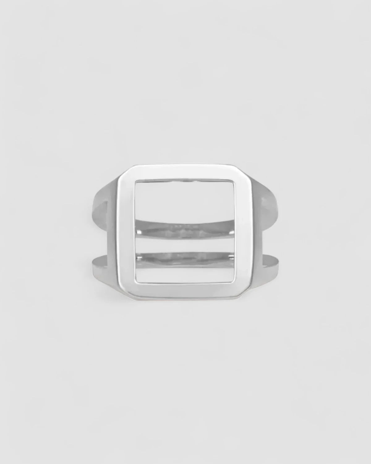Ringens top-plade måler 14 x 14 mm. Smykket er fremstillet i 100% recycled 925 sterling sølv. Alle smykker fra IX er stemplet med 925 IX indvendigt, som er deres faglige navnestempel, registreret af dansk ædelmetalkontrol.