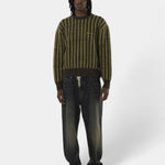 PRE-INTERNET KNIT CASHMERE er en oversized striktrøje, der kombinerer retroinspireret design med moderne luksus. Den varme senneps- og brune stribede farvekombination giver et klassisk udtryk, mens den bløde blanding af uld og cashmere sikrer både komfort og varme. Broderet logo på brystet tilføjer et diskret, grafisk touch. Fremstillet i Portugal, er denne trøje ideel til at tilføre dit outfit et personligt præg, uanset om du er på farten eller slapper af i weekenden.