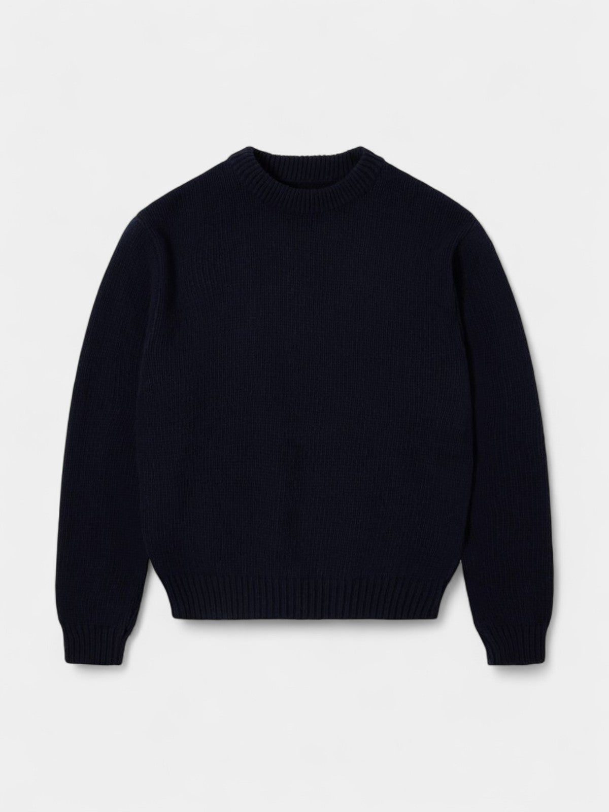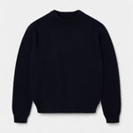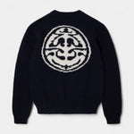 EDWIN Ellis Sweater i Navy / Off White er en strikket trøje med boxy pasform, der kombinerer sæsonpræget design med en varm og behagelig konstruktion, perfekt til de kolde måneder. Den er fremstillet af 80 % fin uld og 20 % polyamid og prydes af et markant beetle jacquard-motiv på ryggen, som giver trøjen et grafisk og karakterfuldt udtryk.