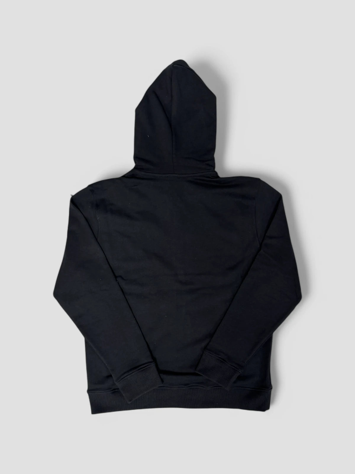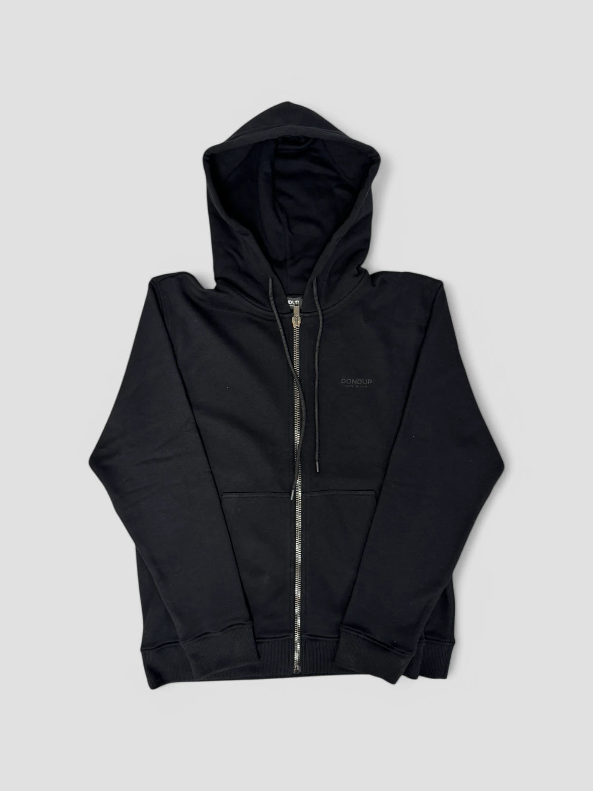 KF0196U Sweatshirt - Sort fra Dondup er en regular-fit hættetrøje i sort, fremstillet af 100% bomuldsfleece for optimal komfort. Den har en praktisk kængurulomme, elastisk ribkant ved håndleddene og en justerbar hætte. Trøjen er prydet med et gummilogo på brystet, hvilket giver et diskret men stilfuldt udtryk. Designet og produceret i Italien