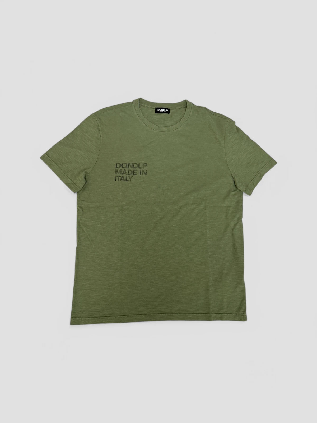 JF0195U T-shirt fra Dondup er en komfortabel t-shirt i armygrøn, lavet af 100% bomuldsjersey, Med sin Regular pasform og rund hals er den ideel til både afslappede og stilfulde outfits.
