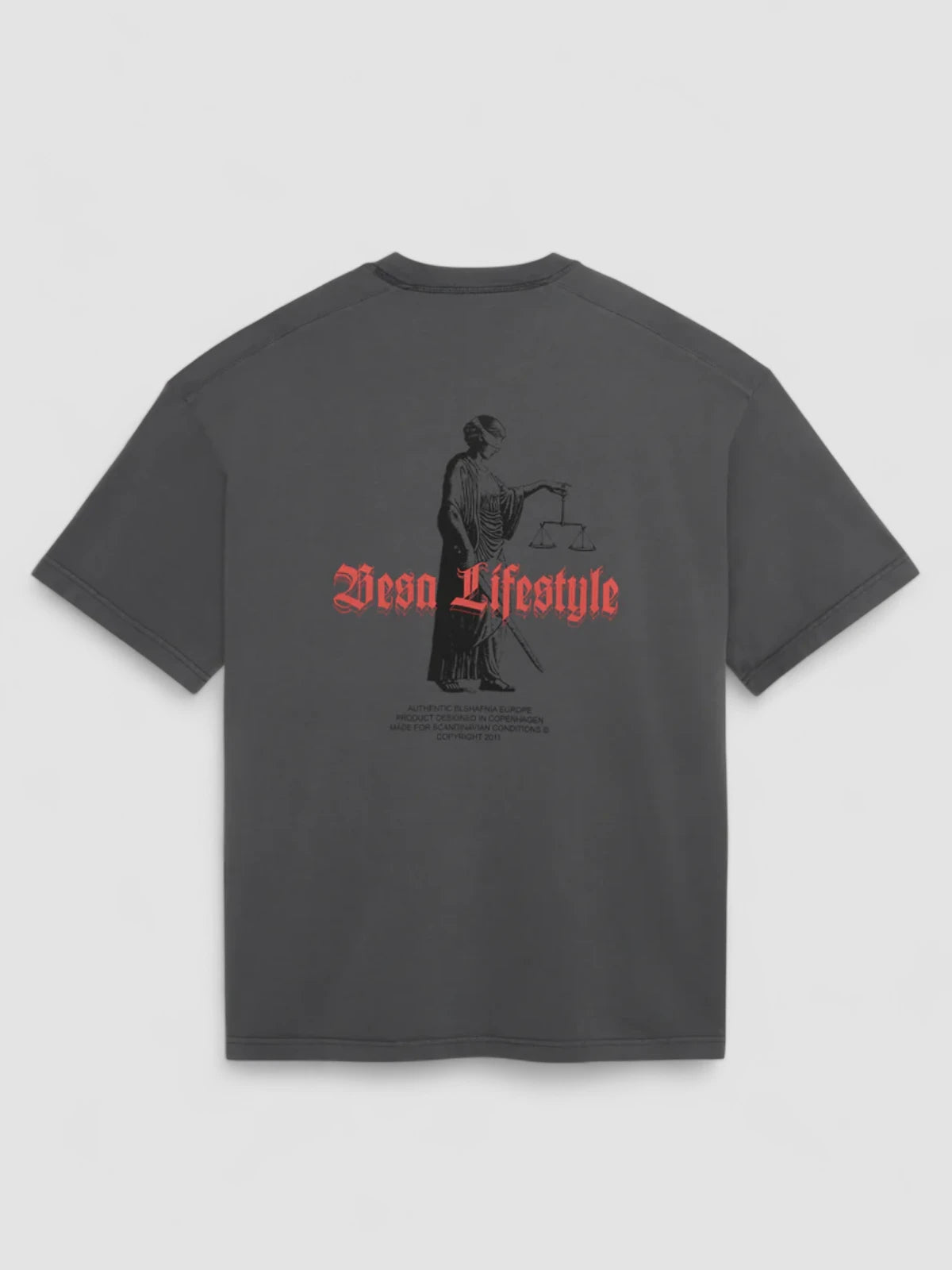 Justice T-shirt Washed er en forvasket box fit t-shirt fremstillet af 100% økologisk bomuld. Den har et washed look med et BLS-print på brystet og et unikt Besa Lifestyle & Lady of Justice-print på ryggen.