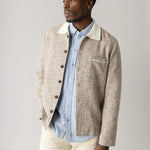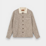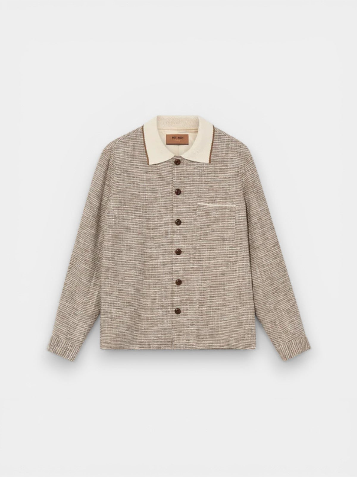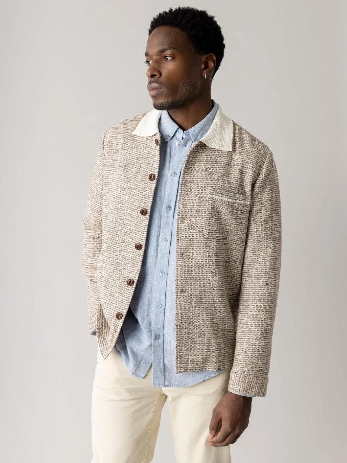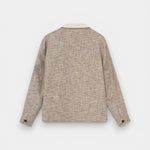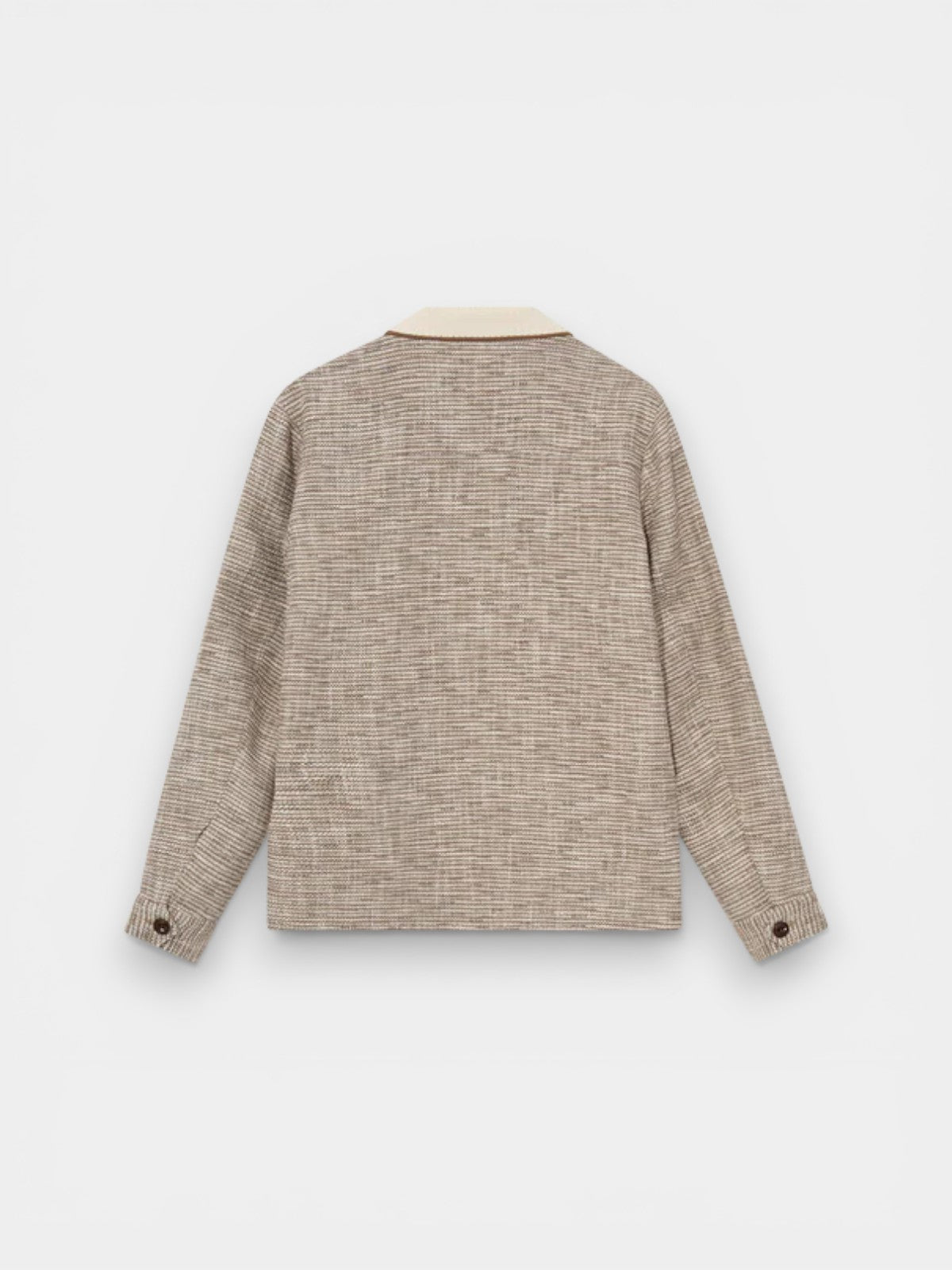 Fremstillet i en blød boucléblanding af bomuld har denne jakke en kontrastkrave, knaplukning og en enkelt brystlomme med diskrete detaljer. Det teksturerede materiale tilfører dybde og karakter og gør den til et raffineret, men alsidigt valg til hverdagsbrug.