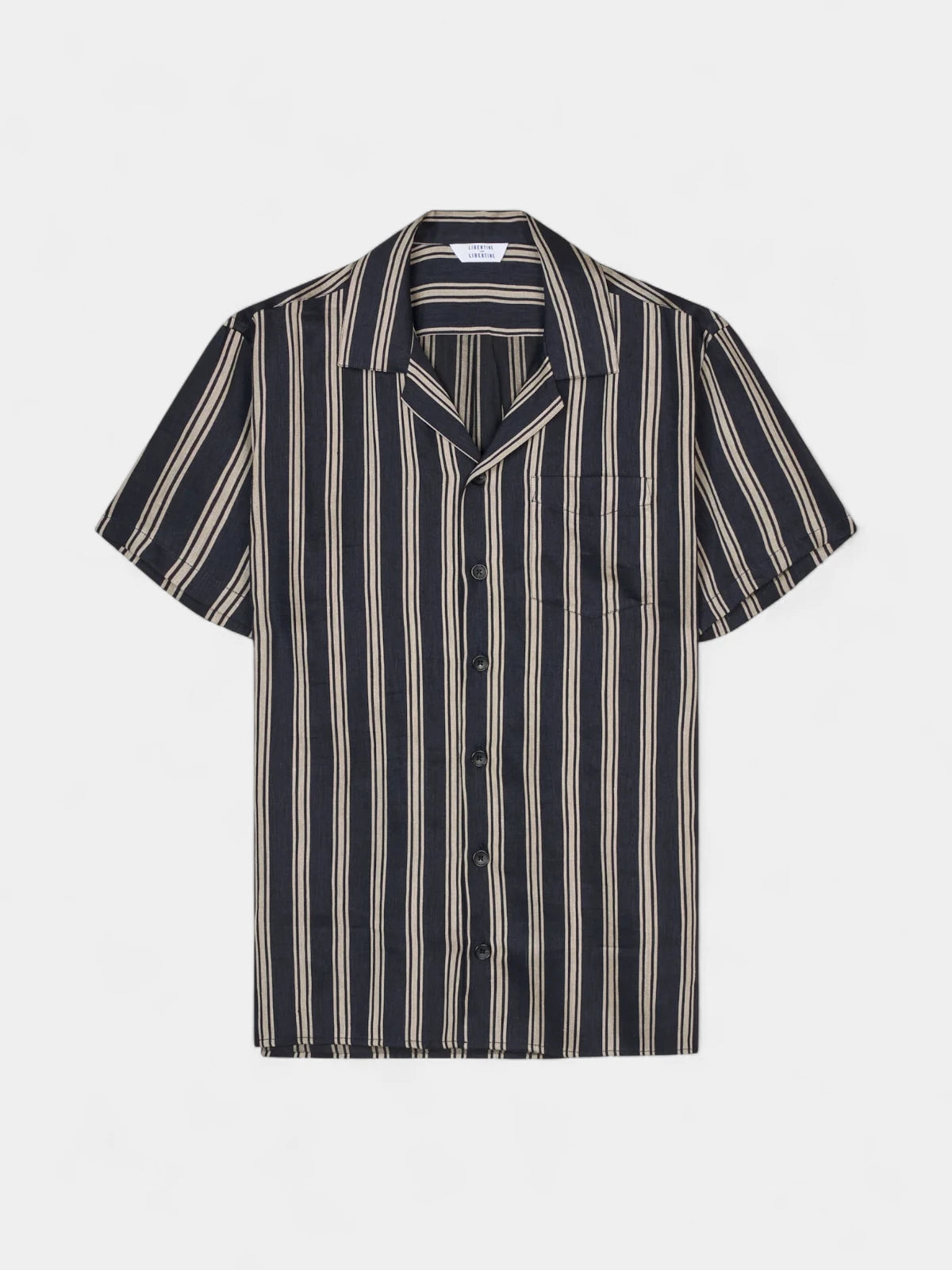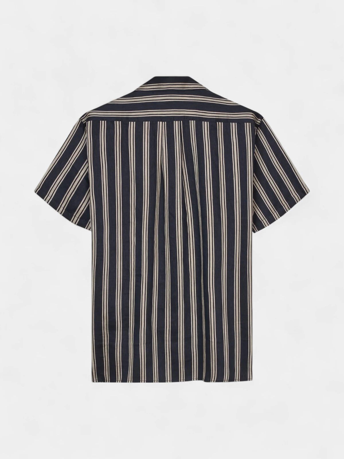 Cave-skjorten fra Libertine-Libertine er en kortærmet skjorte med camp-krave og brystlomme, fremstillet i en let plain weave-vævning. Materialet består af 47% hør, 27% viskose og 26% rayon, hvilket giver skjorten en luftig og behagelig pasform. Den har en normal pasform og er produceret i Portugal.