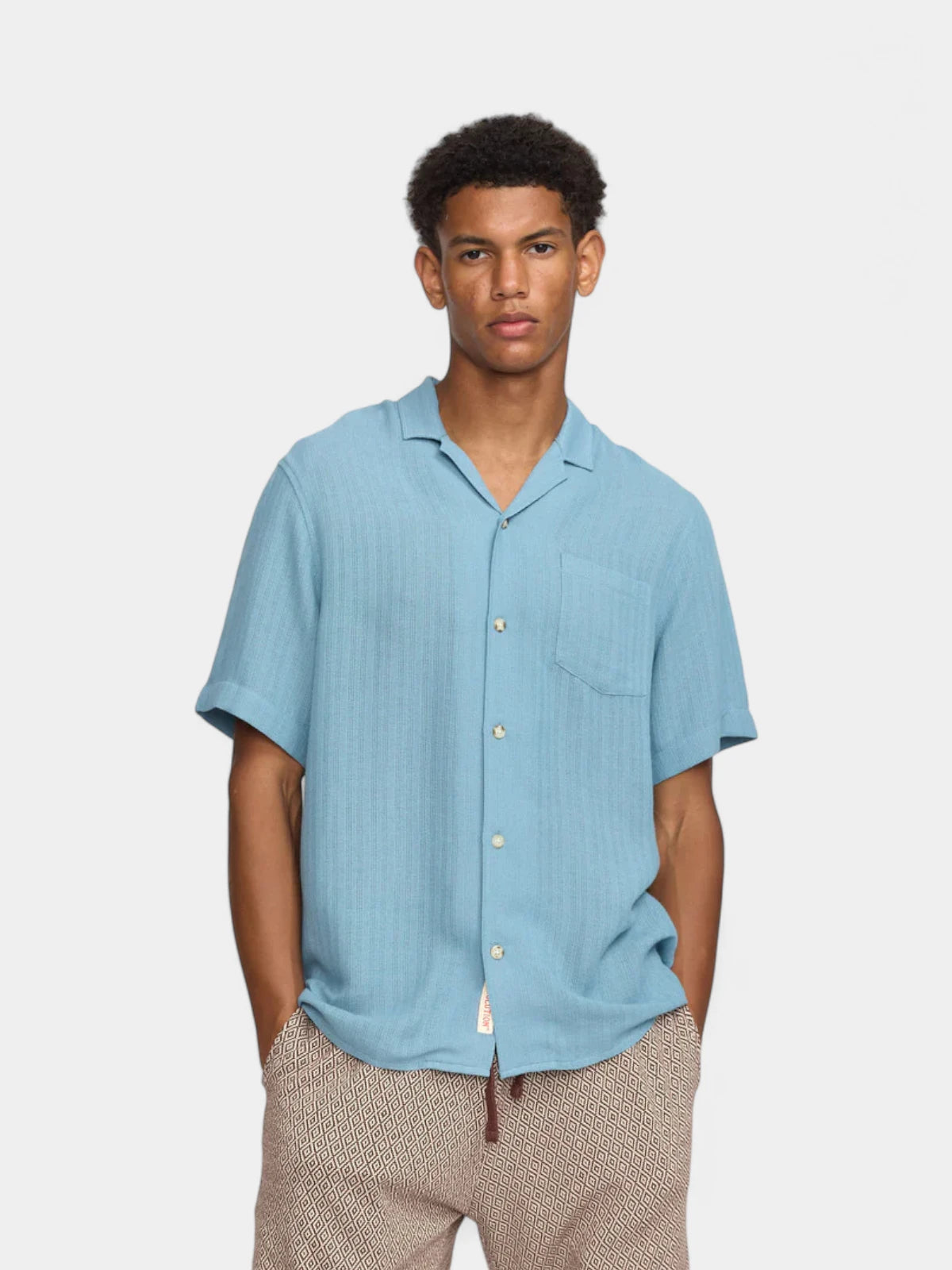 Cuban shirt fra Revolution er lavet af et let og åndbart materiale, hvilket gør den ideel til varme dage. Med sin klassiske cubanske krave og afslappede pasform giver skjorten et stilfuldt og uformelt look. Den blå farve er både alsidig og tidløs, hvilket gør det nemt at style skjorten til både afslappede og mere elegante anledninger. Skjorten har en praktisk brystlomme og en knaplukning, som giver et simpelt, men funktionelt design. Perfekt til afslappede weekender eller feriedage, hvor både komfort og stil er vigtig.