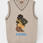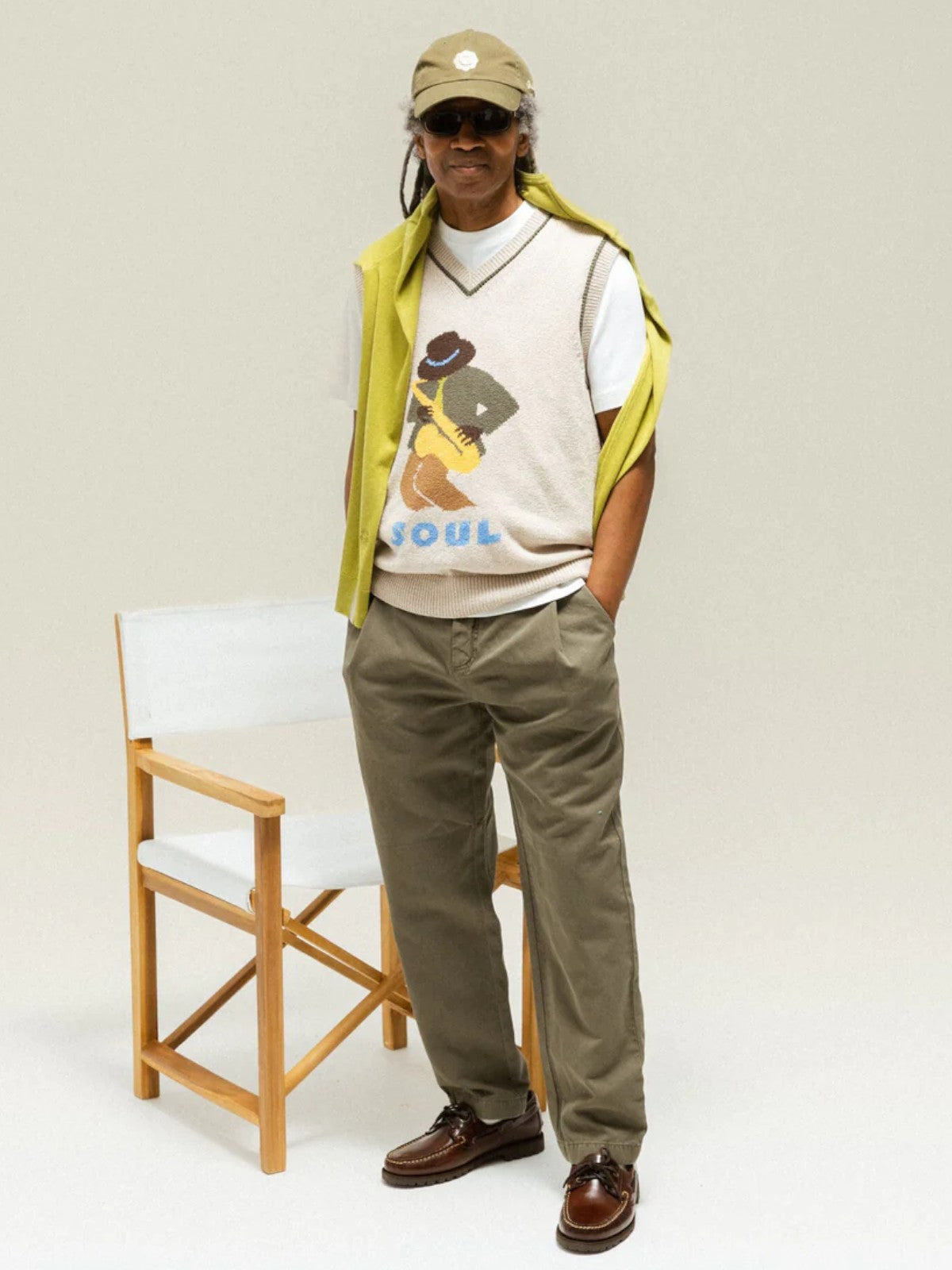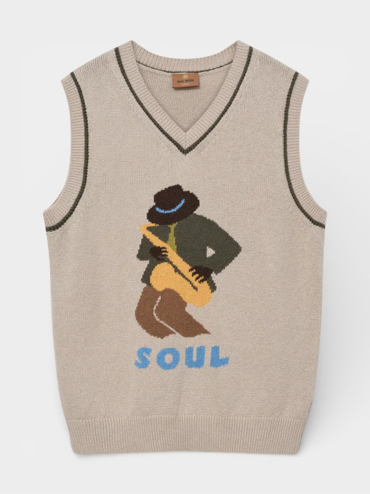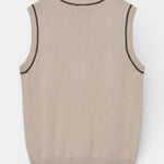 Strikket i ren bomuld har denne vest en afslappet pasform med V-udskæring og ribkanter. Det markante frontdesign tilfører et legende, retroinspireret udtryk, hvilket gør den perfekt til lag-på-lag styling over skjorter eller T-shirts.