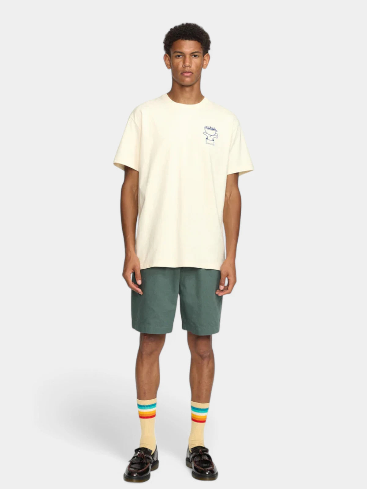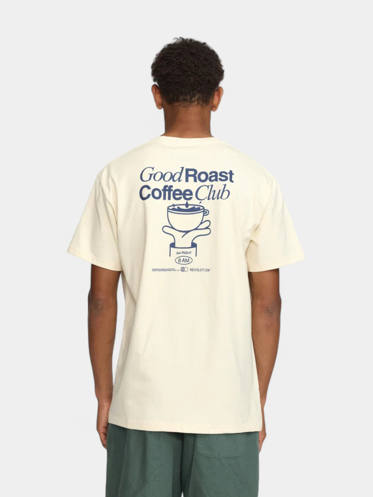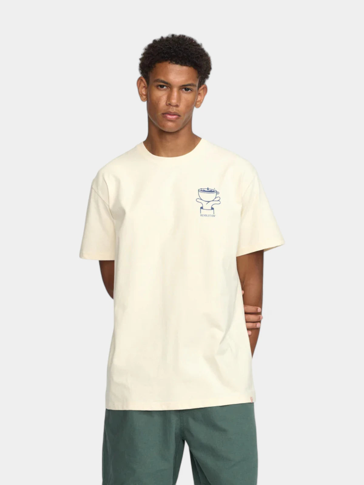 Roa T-shirt i farven Off White er en t-shirt med en afslappet pasform fra Revolution, ideel til både afslapning og hverdagsbrug. Den er fremstillet af 100% økologisk bomuld med en vægt på 220gsm, hvilket giver en stabil og holdbar kvalitet med en let stiv fornemmelse. T-shirten har en rund hals og korte ærmer og prydes af et lille monokromt brystprint samt et stort print på ryggen. Den er afsluttet med en ribbet krave og dobbeltstikninger ved sømmene, hvilket sikrer langvarig holdbarhed.
