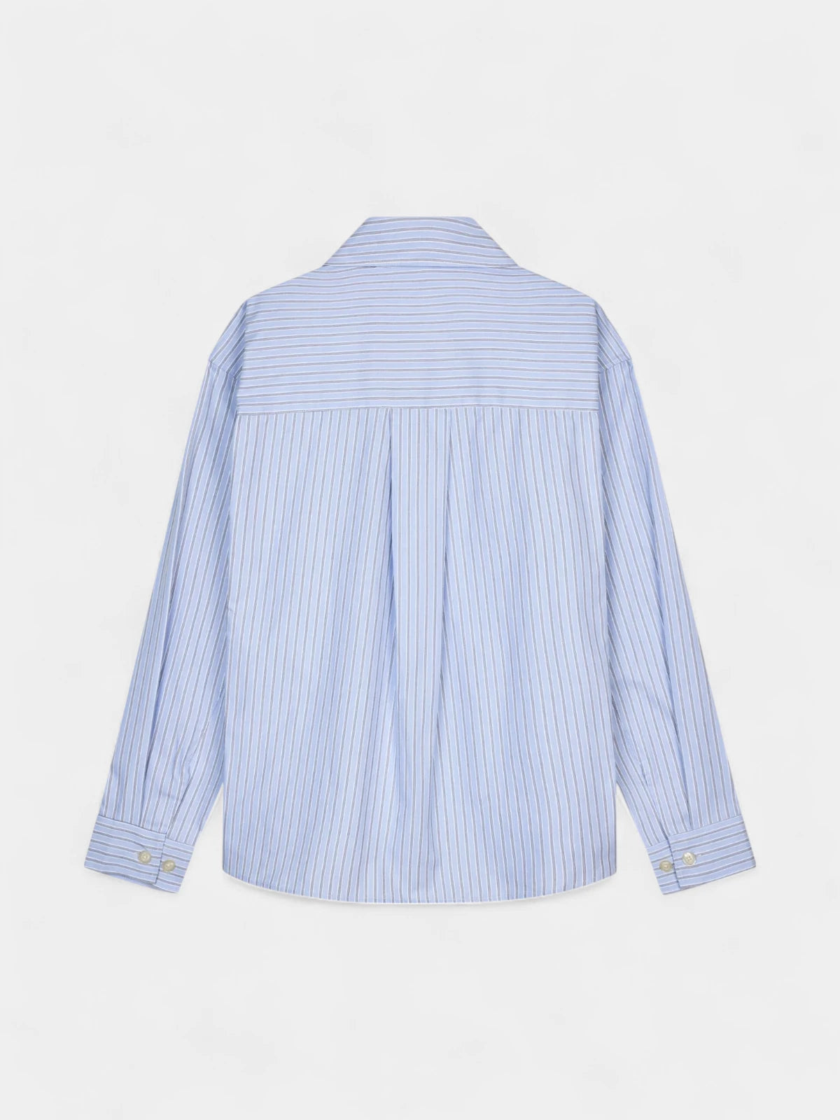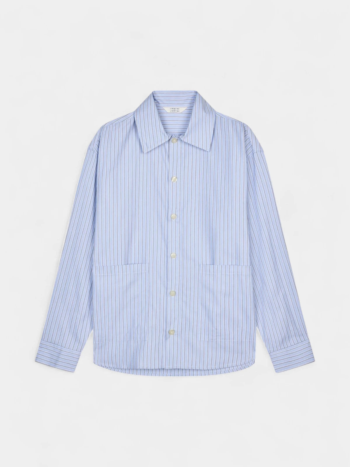 Venture er en rummelig overshirt med et tidløst snit og klassiske detaljer. Den har store, fremtrædende forlommer foran, en buet kant nederst og karakteristiske knapper, der giver den et stilfuldt præg. Skjorten er lavet i et let, sprødt poplinvæv i økologisk bomuld, som sikrer en behagelig og naturlig følelse hele dagen. Mønstret i hvid og blå striber skaber et stilrent og sofistikeret udtryk. Med normal pasform er denne overshirt ideel til både afslappede og mere stilfulde outfits, og den kan bruges som let jakke eller skjorte.